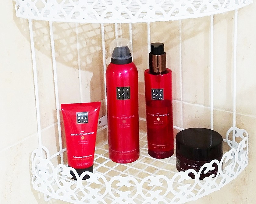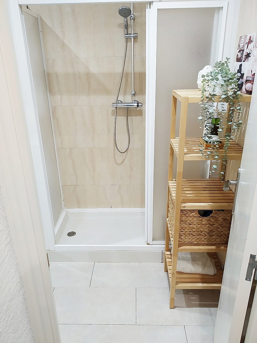 Badezimmer: ein komplettes Badezimmer mit Dusche und Duschabtrennung, Waschbecken mit Unterschrank, zusätzlichem Möbelstück, Holzregal und Badezimmerzubehör.