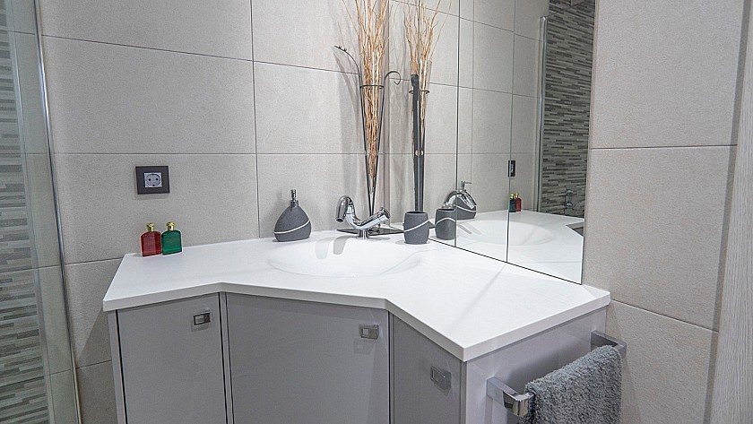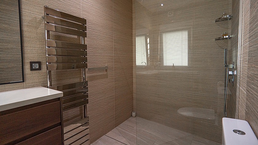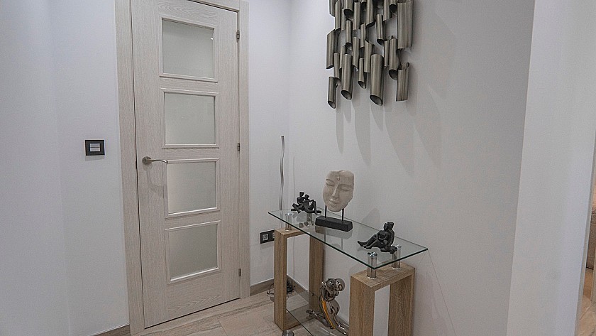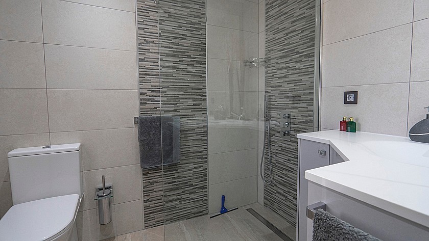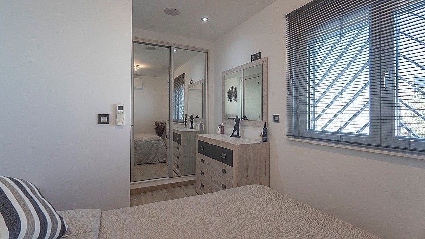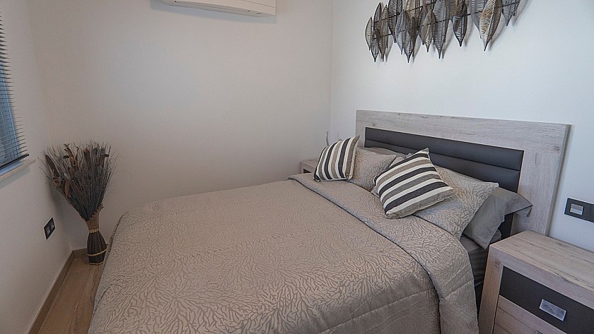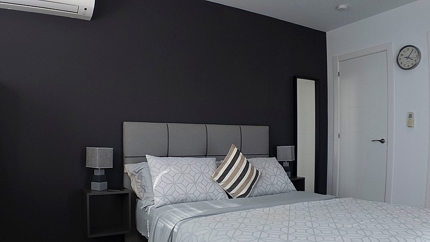 Über einen Flur gelangen Sie zu zwei weiteren Schlafzimmern, beide mit Einbauschränken und Klimaanlage. Das Hauptschlafzimmer verfügt über ein großes eigenes Badezimmer mit Doppelwaschbecken, Dusche und beheiztem Handtuchhalter.