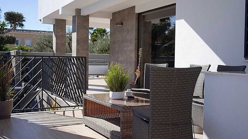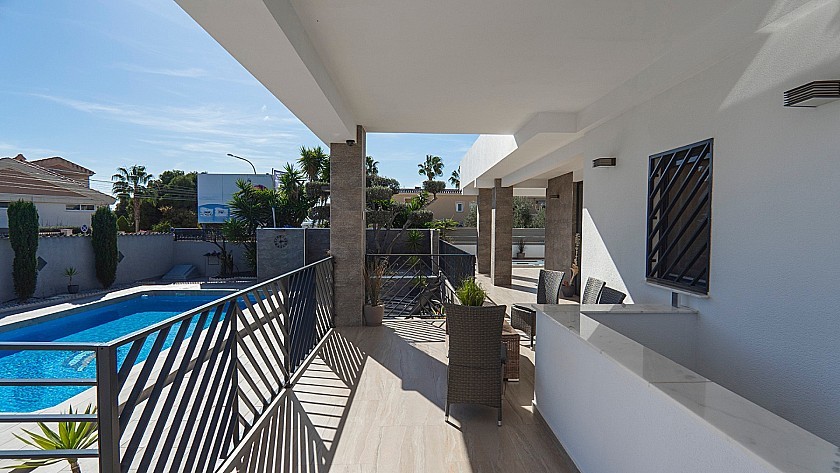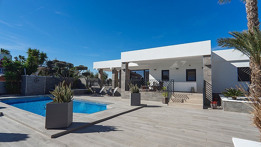 Rund um das Haus befindet sich eine große, im Gartenstil geflieste Terrasse, auf der Sie im Schatten sitzen und die Aussicht auf den Pool, den Whirlpool und die Berge in der Ferne genießen können. Gibt es einen schöneren Ort, um gemütlich zu frühstücken oder den Tag bei einem Drink bei Sonnenuntergang ausklingen zu lassen?