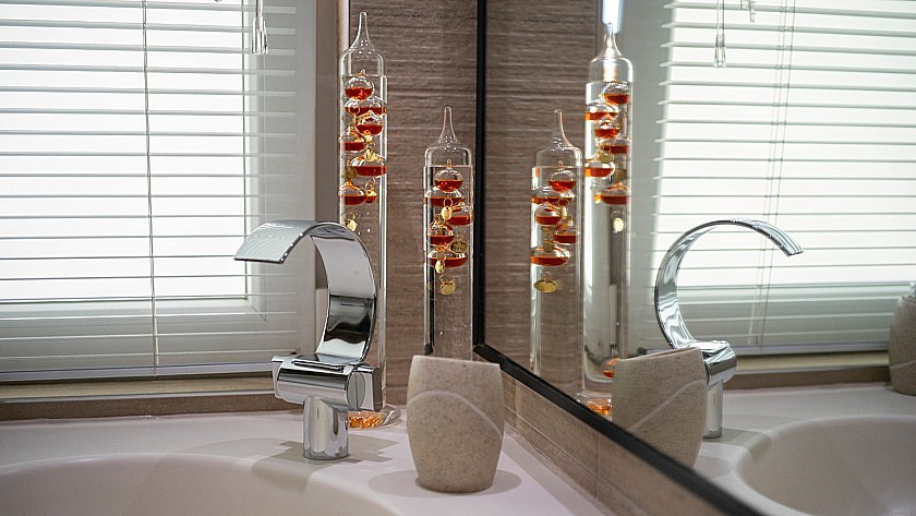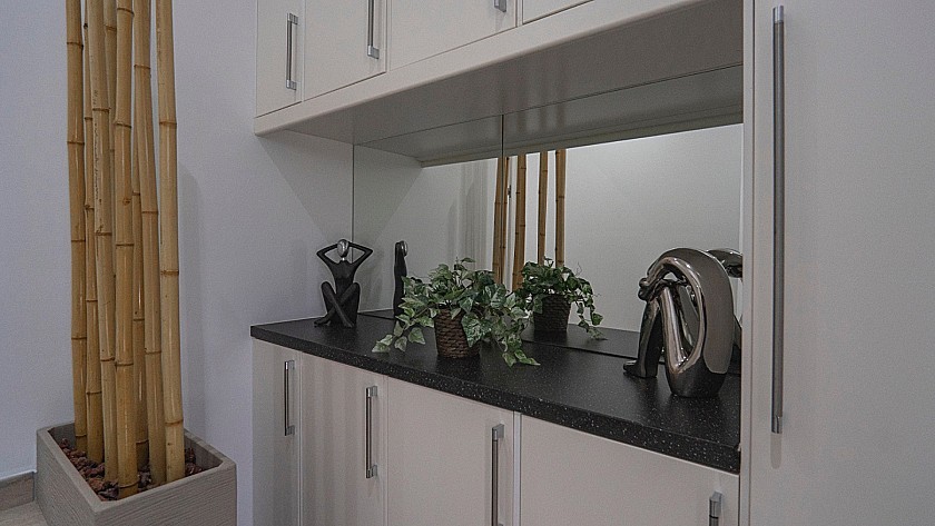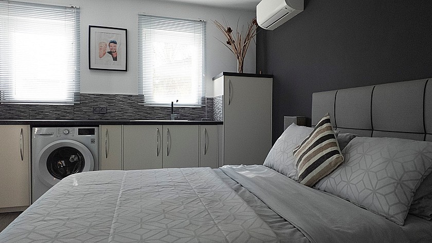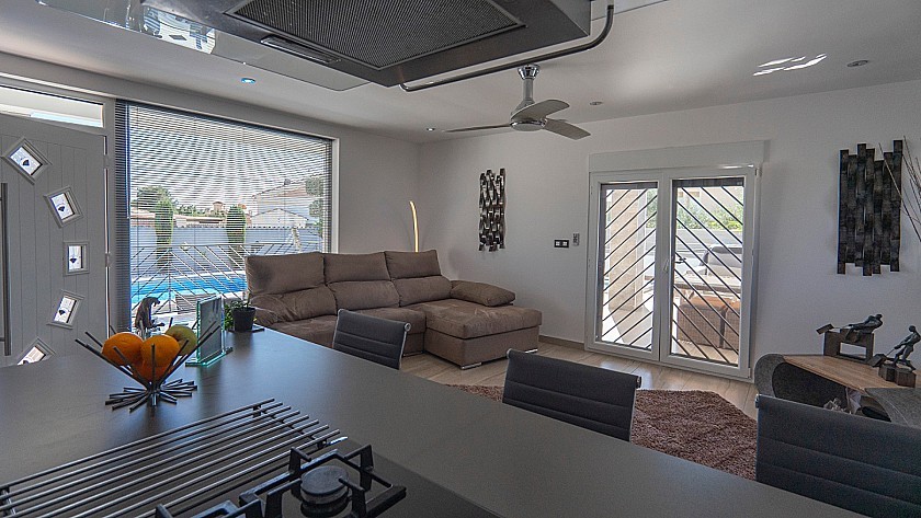 Qualität und Stil spiegeln sich auch im Hauptgebäude wider. Das große, offene Wohnzimmer bietet Ihnen viel Platz zum Entspannen und Essen. Eine Frühstücksbar trennt das Wohnzimmer von der Küche. Wie der Rest des Anwesens ist die Küche modern und mit den besten, modernsten Geräten ausgestattet.