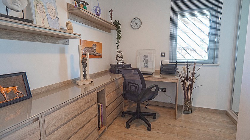 Das erste der drei Schlafzimmer im Haupthaus befindet sich neben dem Wohnzimmer. Die derzeitigen Eigentümer nutzen es als Büro, es ließe sich aber auch als geräumiges Doppelzimmer nutzen.
