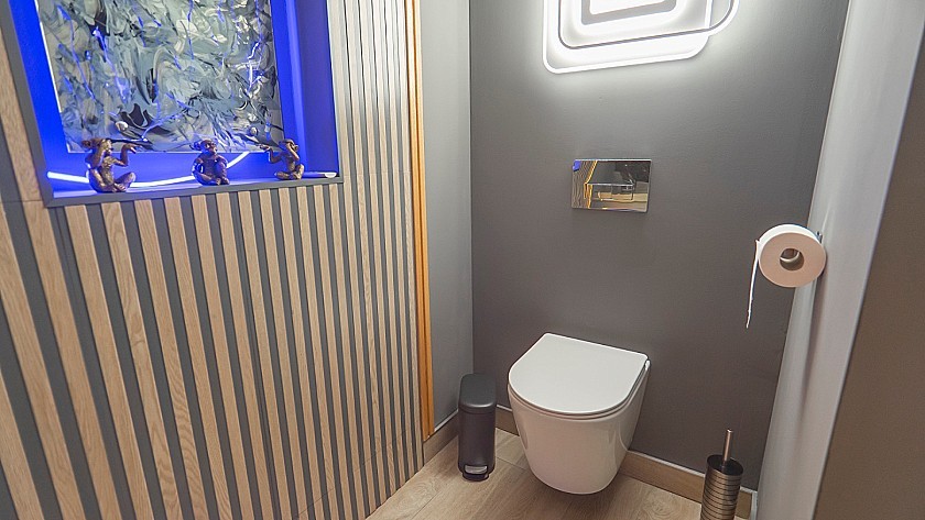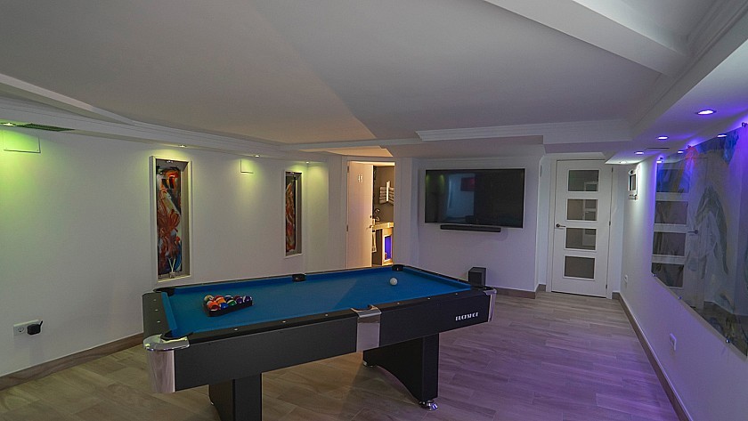 Während das Erdgeschoss perfekt zum Entspannen ist, eignet sich die untere Etage ideal für die Unterhaltung. Es gibt eine Bar, einen Billardtisch, Darts und einen Fitnessraum sowie getrennte Toiletten für Sie und Ihn. Intelligente Stimmungsbeleuchtung verleiht diesem Raum Atmosphäre.