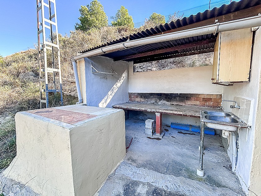 Auf dem Grundstück befinden sich zahlreiche Nutzungsmöglichkeiten: ein Bassin mit Abstellraum, das derzeit als Pool genutzt wird, sowie ein Barbecue-Bereich und eine Sommerküche, ideal für das Leben im Freien. Darüber hinaus gibt es ein separates kleines Gebäude, das sich hervorragend als Lagerraum, Werkstatt, Büro oder potenzielles Gästehaus eignet. Ein Wasserreservoir (Aljibe), Bewässerungswasser, Stromanschluss sowie ein elektrisches Eingangstor sind ebenfalls vorhanden.