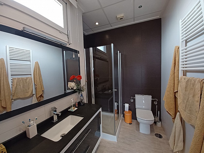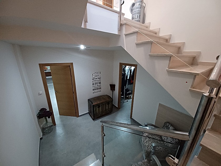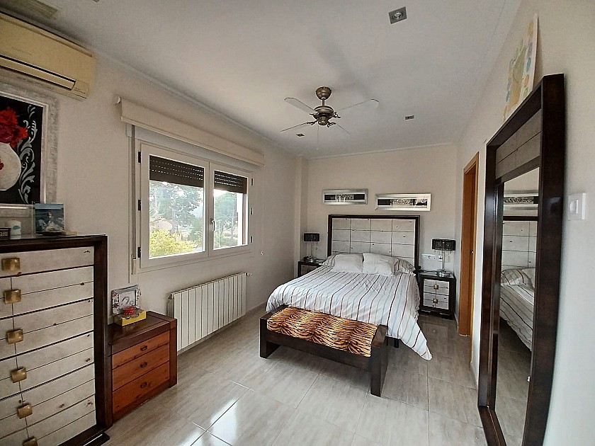 Das nächste Schlafzimmer ist 3, ebenfalls mit Einbauschränken und Doppeltüren zur großen Terrasse. Hier befindet sich der Zugang zum Solarwarmwasserspeicher und zur Klimaanlage für das Erdgeschoss sowie die Anschlüsse für die Anlage im ersten Stock (alle Leitungen sind vorinstalliert, die Maschine muss jedoch noch eingebaut werden). Die letzte Tür führt in die Master-Suite. Hier befindet sich ein großer begehbarer Kleiderschrank mit Schiebetüren, voll ausgestatteten Regalen und LED-Beleuchtung. Vom Schlafzimmer aus führen Doppeltüren auf die Terrasse an der Vorderseite des Hauses und eine Schiebetür zum geräumigen En-Suite-Bad mit großer begehbarer Dusche, großem Waschbecken, WC und Handtuchwärmer.