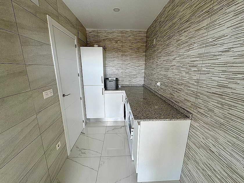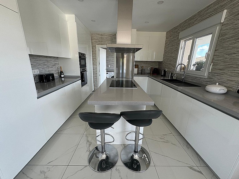 Die Küche ist mit weißen Hochglanzschränken mit Marmorarbeitsflächen ausgestattet. Es gibt auch eine Kücheninsel mit Sitzbereich. Alle Haushaltsgeräte sind im Verkauf inbegriffen. Die Waschmaschine befindet sich im Hauswirtschaftsraum neben der Küche. Auf dieser Etage befindet sich auch eine fantastische Master-Suite.