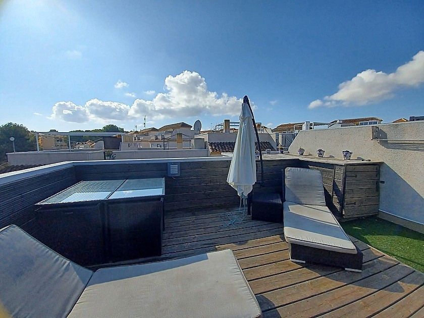 Up a second flight of stairs, you arrive at the solarium / roof terrace, with plenty of space, with a shower in one corner, a BBQ area, a lovely decked seating area and a great storage space so you can put away all of your chairs and loungers etc. There are lovely views across the countryside, and a partial sea view in the distance.