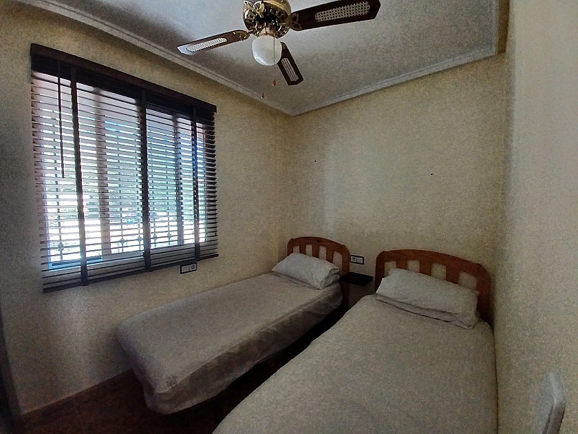 Off the living room is an archway into the small, but fully equipped kitchen, with electric oven and hob plus a washing machine. From the other side of the living room is another archway leading to the two double bedrooms, both with air conditioning and ceiling fans, plus the master with built in wardrobes. The bathroom is in between the two bedrooms, with a WC, bidet, sink and bath with a shower over. All windows have fly screens and fast fibre internet here.