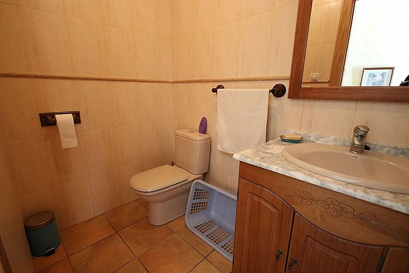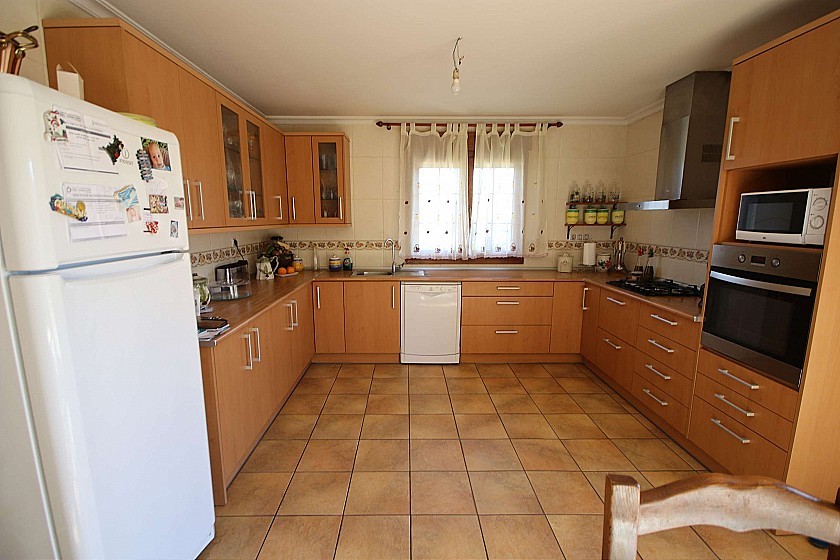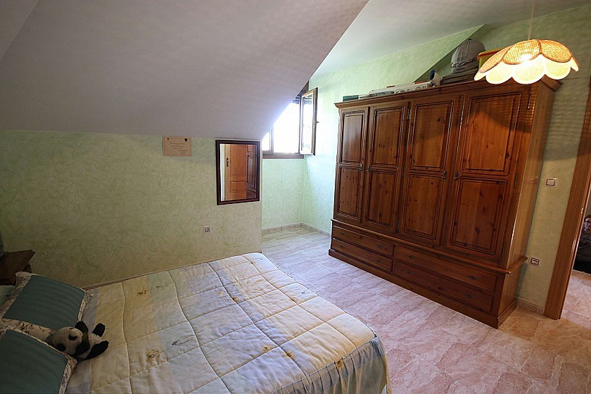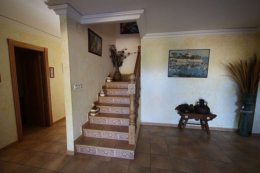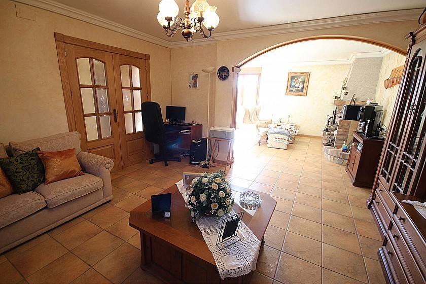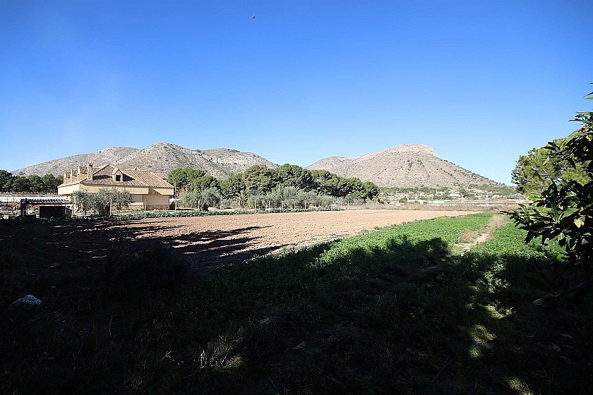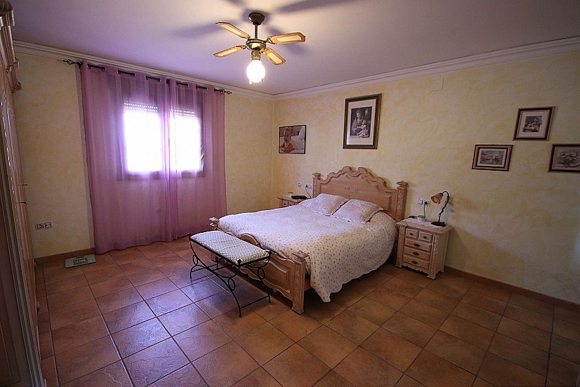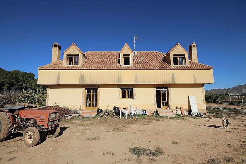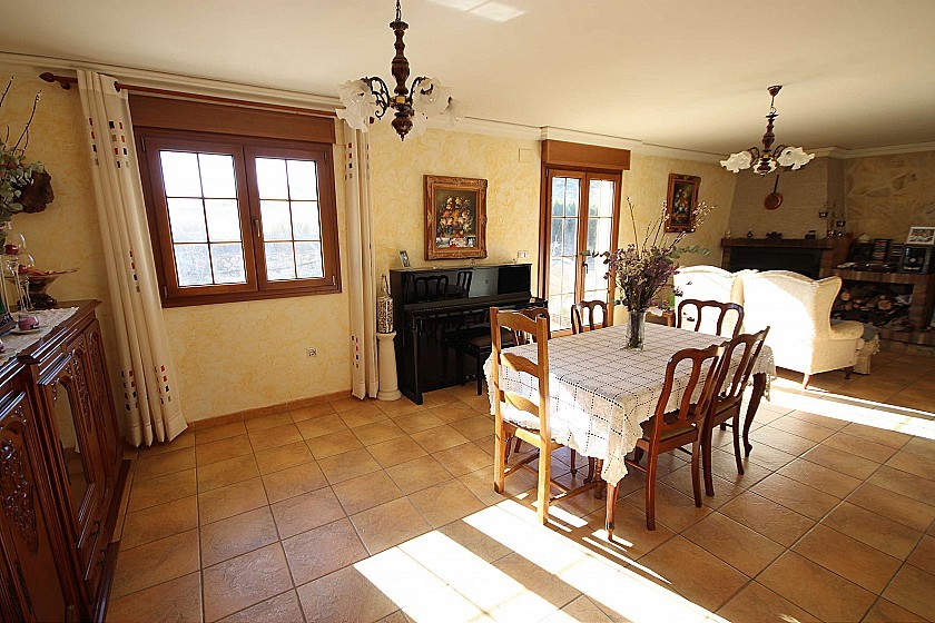 Detached Villa near Aspe, Alicante, with a size of 380m² and a plot size of 10.000m², fully fenced. The property has 5 bedrooms, 3 bathrooms and one toilet, as well as a kitchen – dining room, lounge with a dining area and fireplace, and separate lounge/library area.