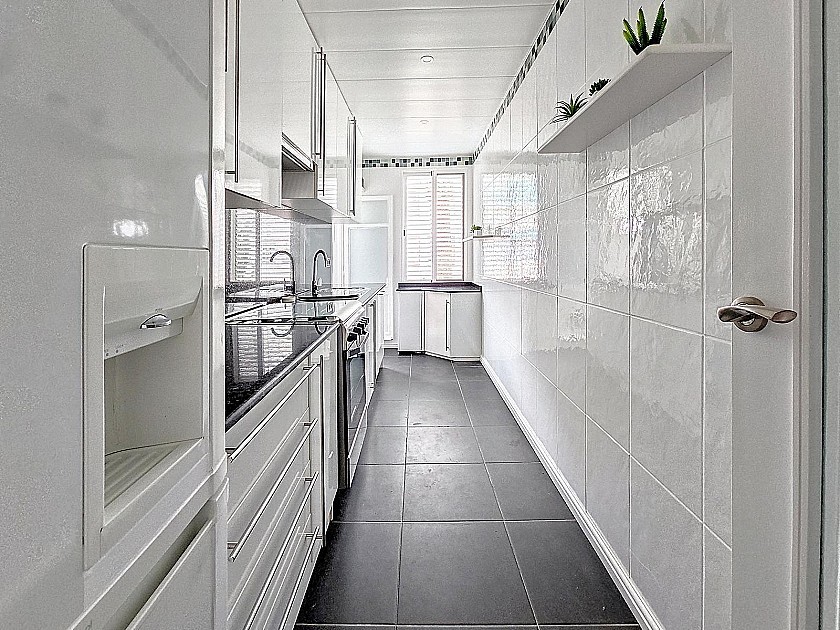 The apartment located on the 1st floor consists of an entrance hall with built-in storage cupboards, kitchen, separate laundry room, bedroom with ensuite, living-dining room with balcony and a master bedroom with large en suite and was totally renovated in the last 2 years.