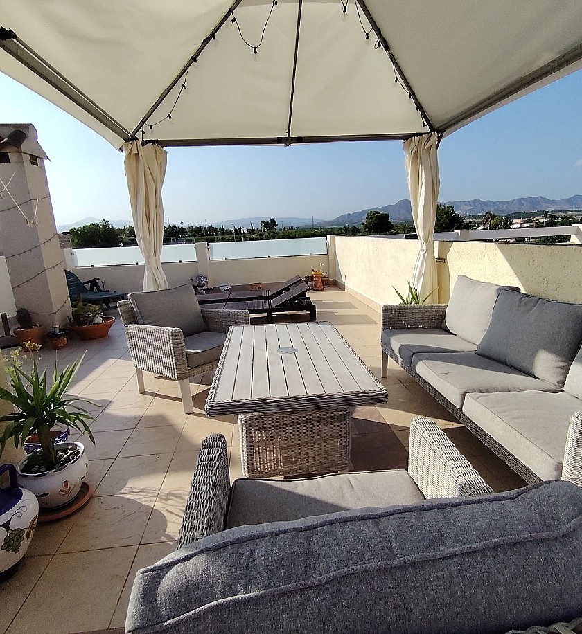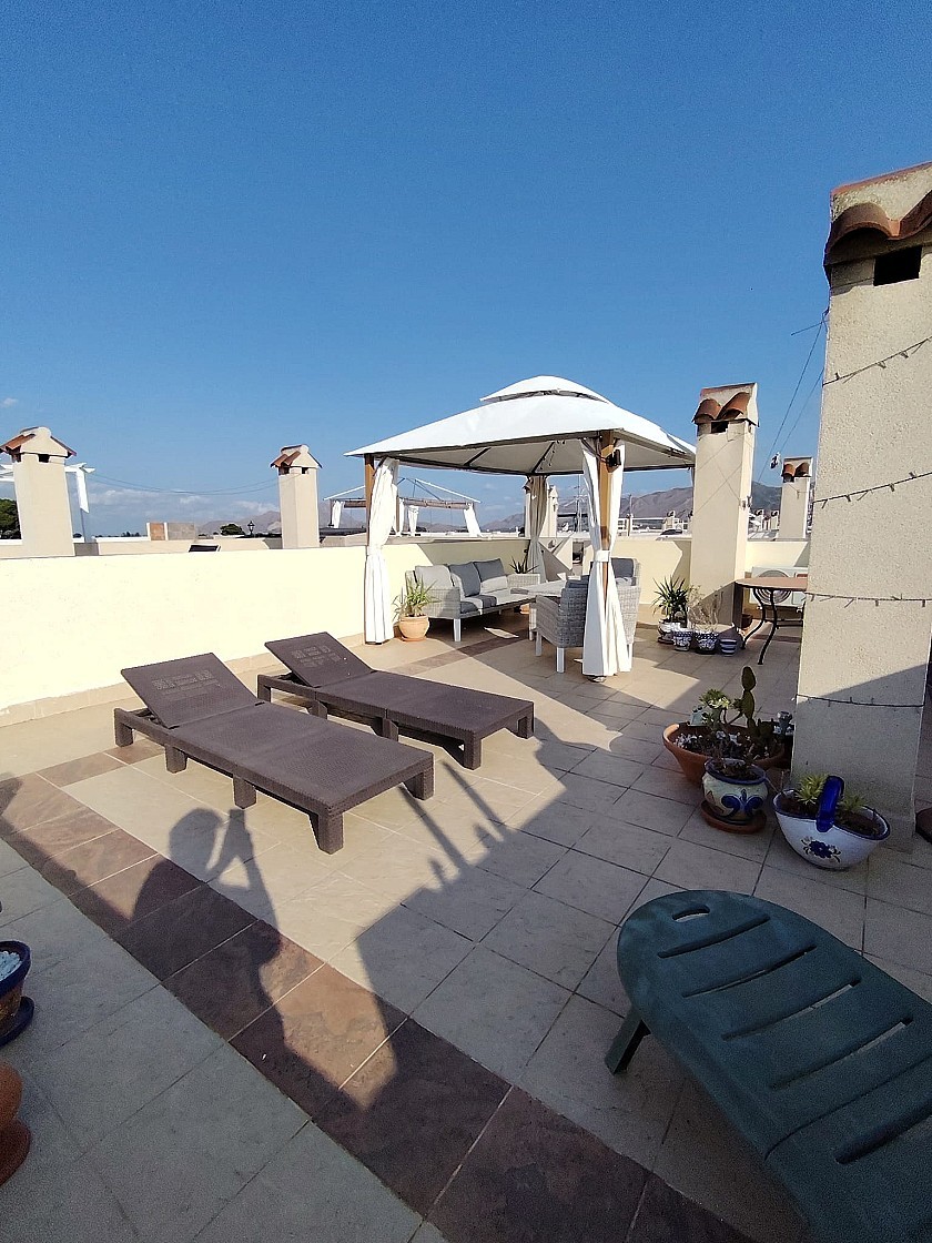 Outside of the back door is a handy utility area with washing machine and tumble dryer, plus the new 100 litre hot water heater tank. up some steps on to the very large roof terrace with glass balustrades and open views over the mountains beyond. There is also a brick-built BBQ and a large gazebo here for shade.