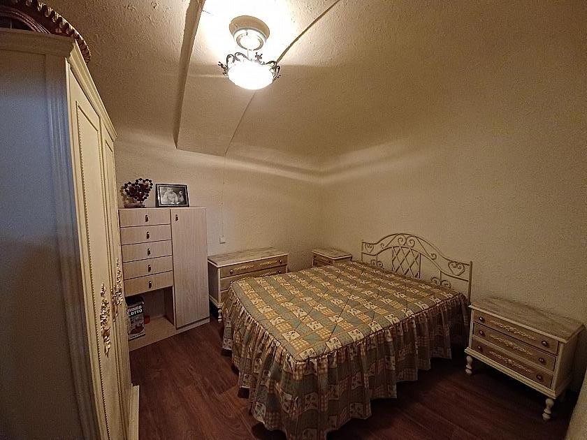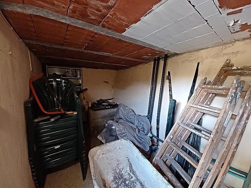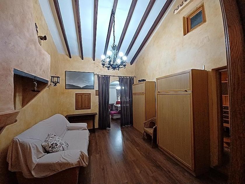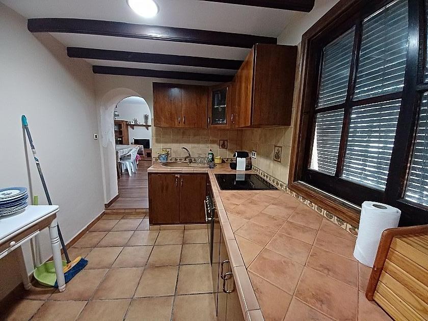 Back to the living room where we entered, is the doorway to the kitchen, fully equipped and with a huge open fireplace/ grill for Paella or BBQ, there is a pantry and door to the rear patio and bathroom. Off the patio is a second cave room, being used for storage just now.