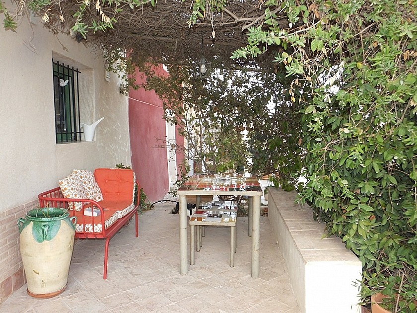 On approach to the property, a nicely presented raised covered terrace with seating area enjoys views over rustic countryside. The terrace is adorned by climbing plants and shrubs.