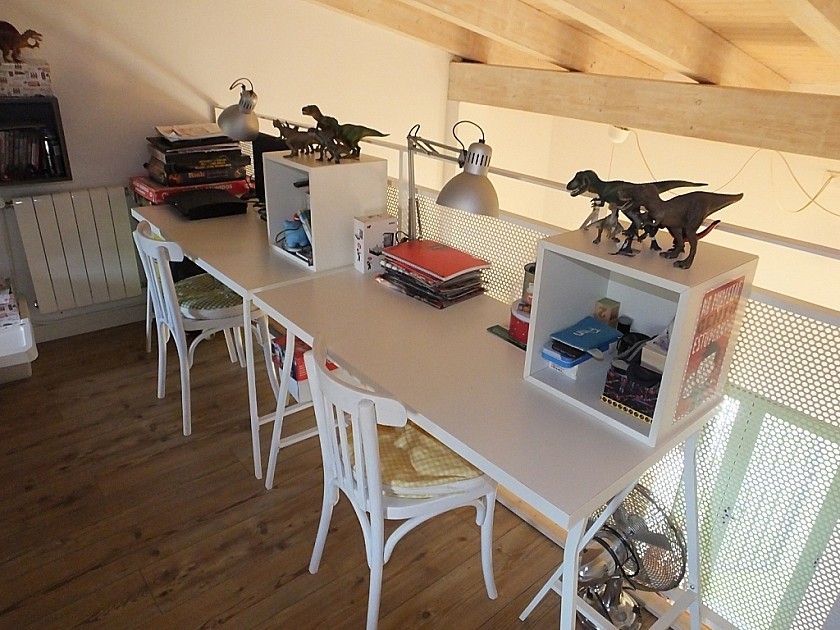From the second bedroom, there is a staircase leading to a mezzanine level with a third bedroom and study area.