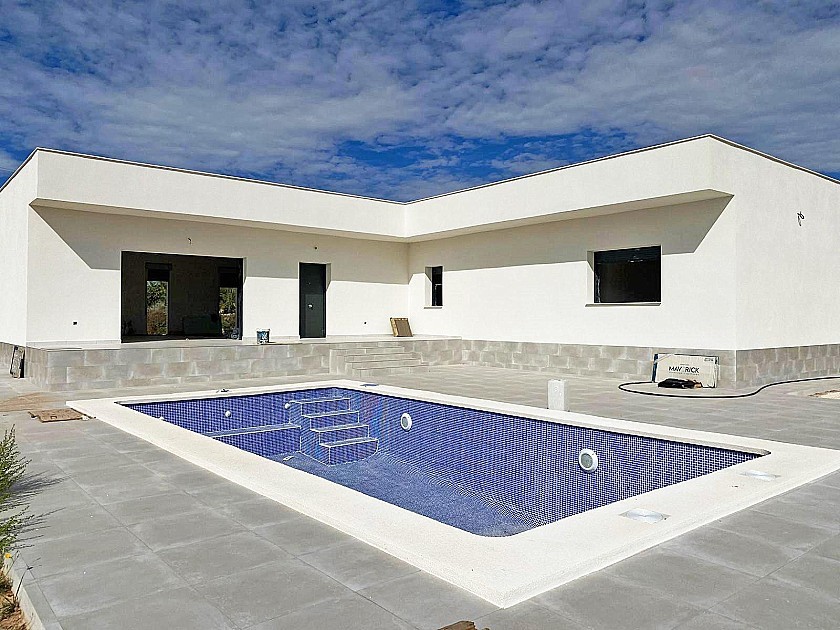 This new modern-style villa is nearing completion. The villa is located in Pinoso, 5 minutes walking distance where you will find all amenities.The villa is 160m² big and comprises a large living area with lounge/dining room and fitted kitchen (for €3,000) a laundry room, 3 bedrooms, 2 of them with fitted wardrobes and 1 Bedroom with an ensuite Bathroom. There is also 1 guest Bathroom .The villa has pre-installation for air-conditioning throughout the house (hot/cold), running water and electricity.The plot is 13,000m² large, of which 3,000m² has been fenced off. There is an 8x4m swimming pool with outdoor shower. Access to the property is via an electric gate.There is a choice of finishes and extras (kitchen, bathroom, etc.). If you're looking for a new build but don't want to wait months, this villa is for you.