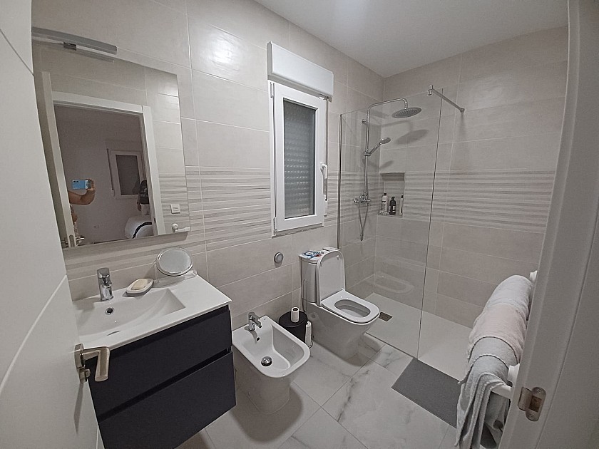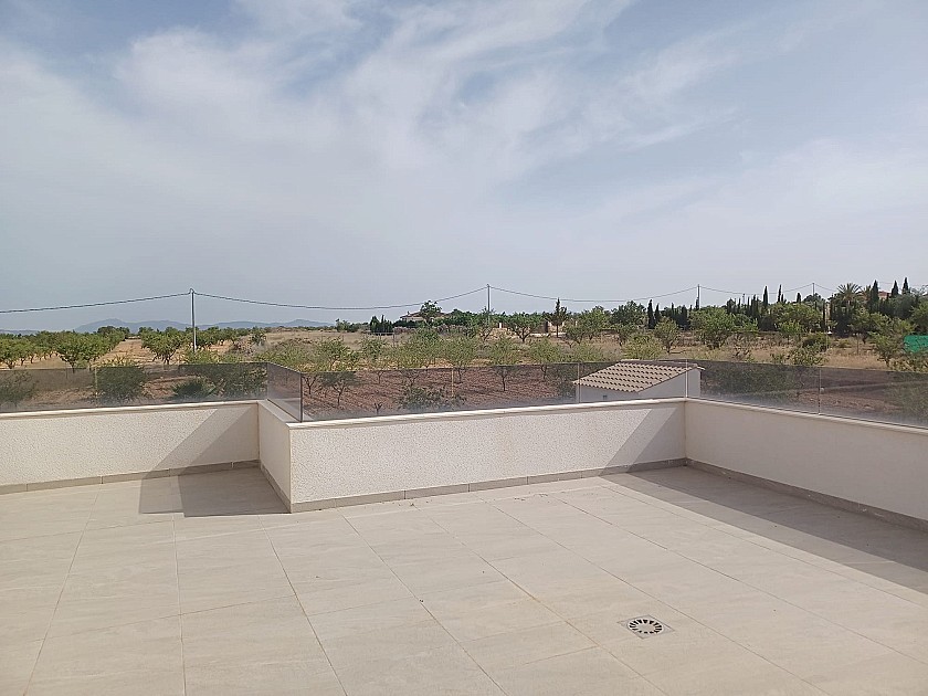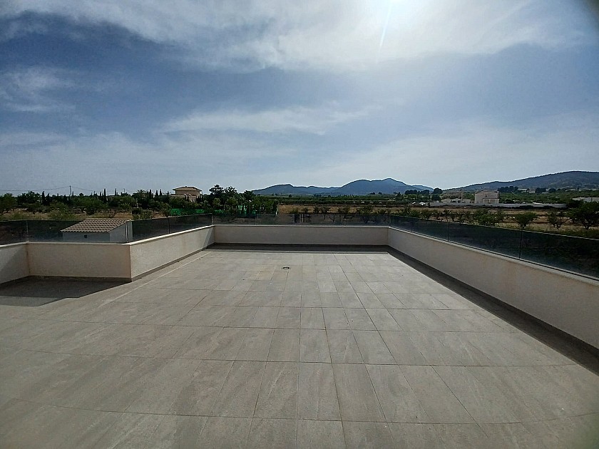 The third bedroom or master, is larger, with sockets plus USB both sides of the bed and also has a dressing room with shelves and drawers etc plus an ensuite bathroom with WC, sink and walk in shower. also here are double doors onto a huge roof terrace, with anti-slip tiles and low walls and smoked glass balustrades to make the most of the amazing views.
