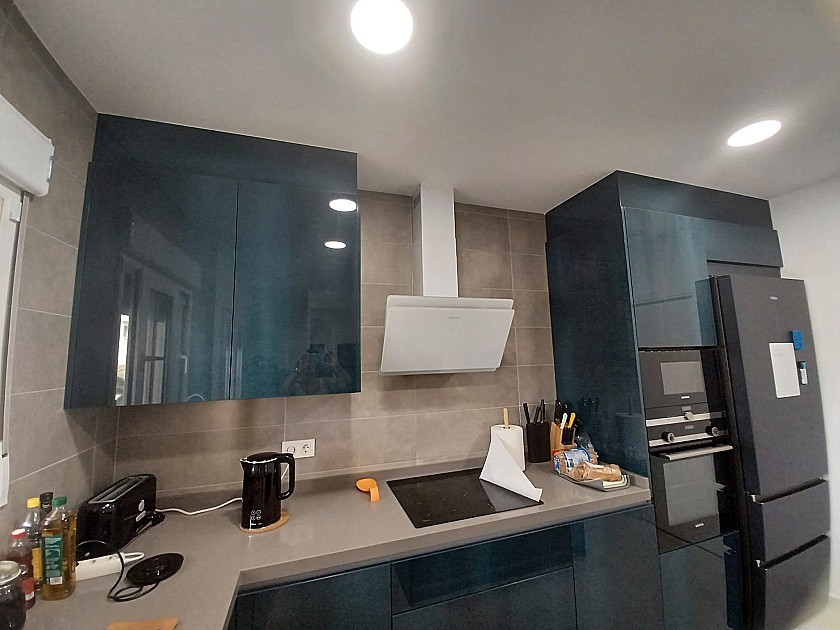 The kitchen is fully fitted with beautiful cupboards and an island with three seats to one side, plus a pop-up socket here, the island and worktops are made from a grey silstone (very durable). The kitchen is equipped with built in oven, microwave, electric hob and extractor fan plus dishwasher, all of the quality Siemens make, plus a tall fridge freezer. A window over the sink looks out on the garden and pool area, and double doors lead out to the covered terrace.