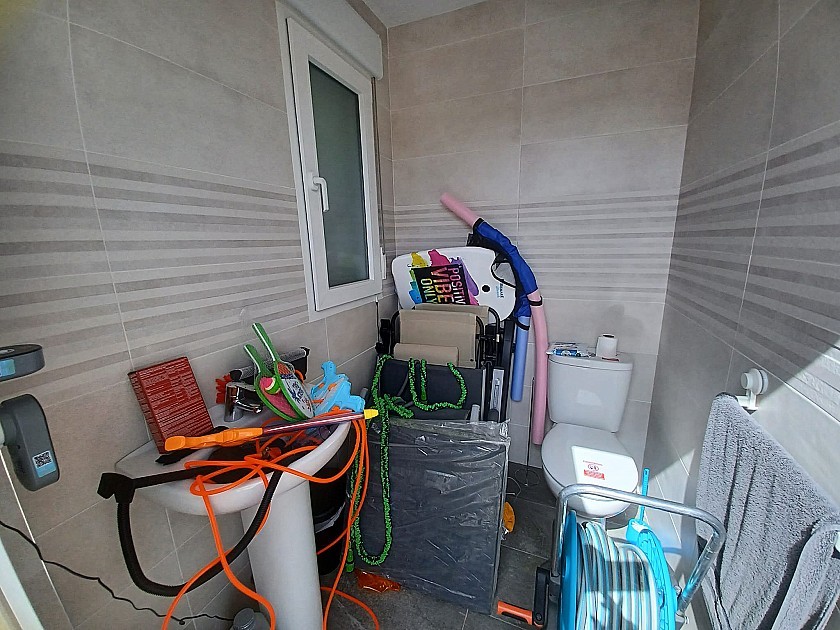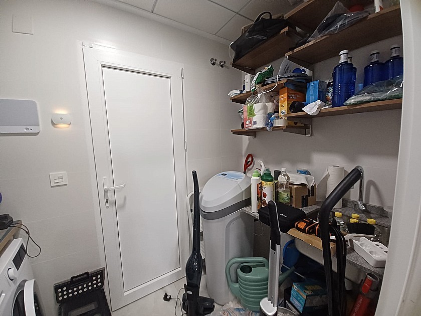 From the kitchen a sliding pocket door leads into the utility room, with washing machine and tumble dryer, electric water heater, water softener and plenty of shelving, a door leads to the exterior, practical for taking out the washing or bringing in the shopping etc. The water heater is also connected to a solar panel outside for hot water.