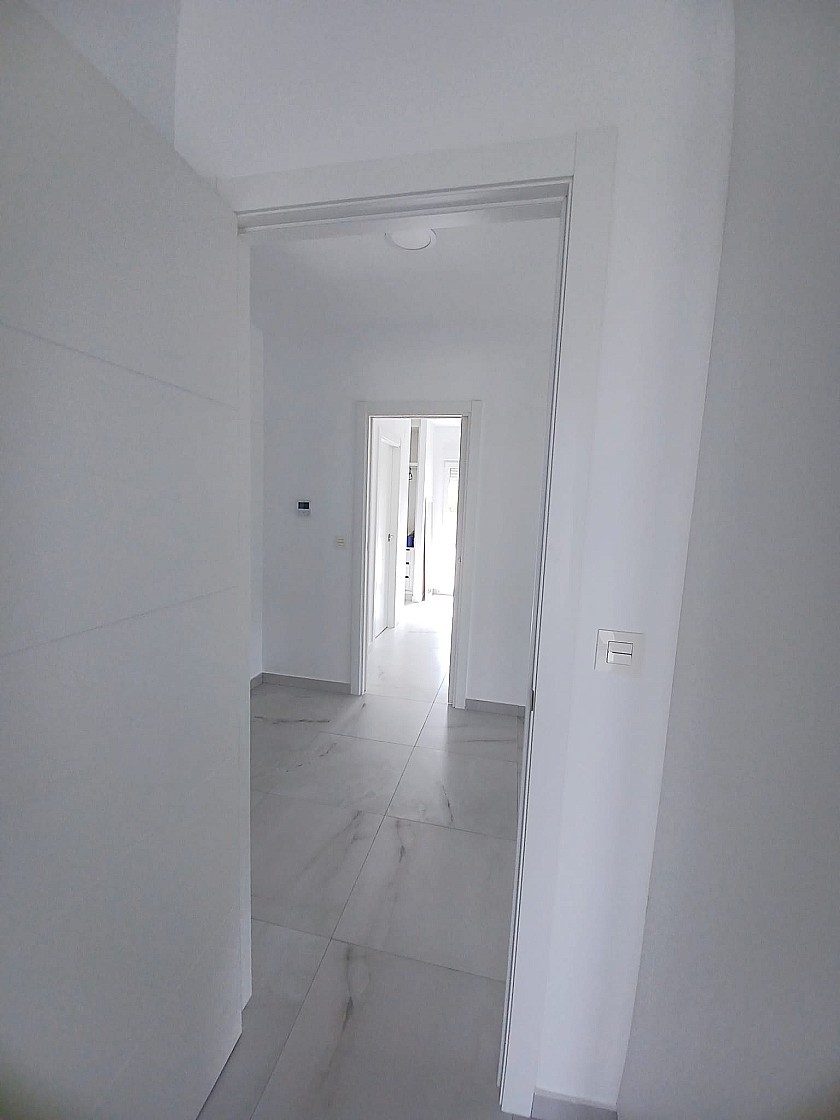 The main entrance is from the long 32m covered terrace with a half-height wall and smoked glass balustrades which covers the full length of the house, facing the pool and gardens, you enter into a large hallway with white marble effect porcelain tiles throughout and onto the open plan living room and kitchen area with white marble stairs off to the first floor.