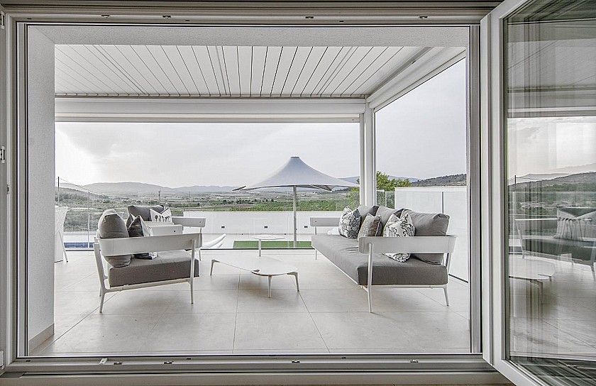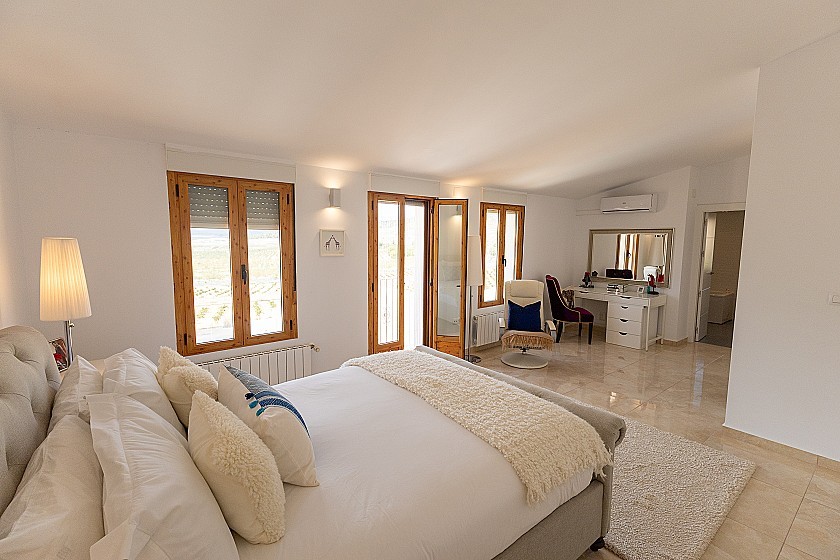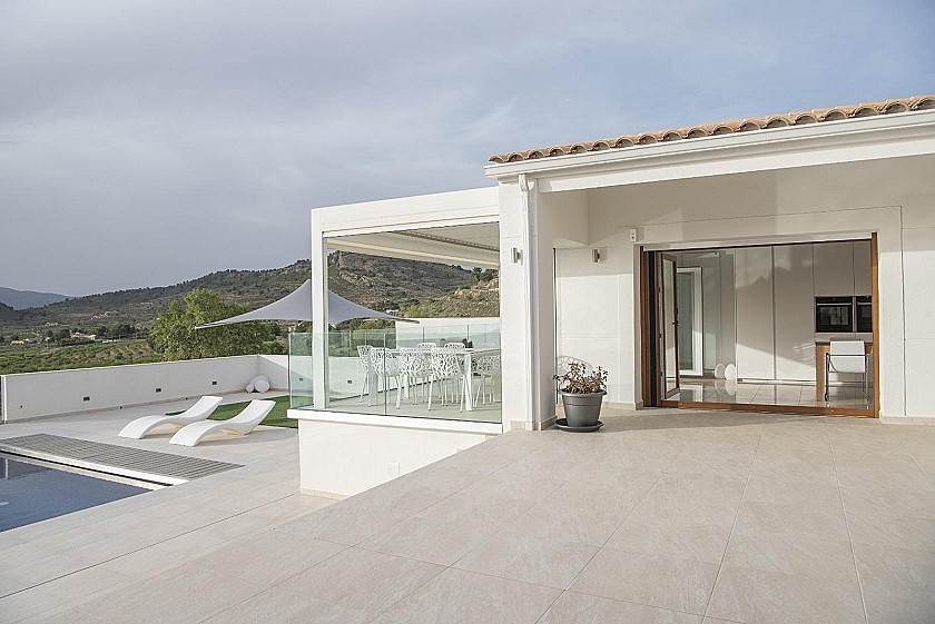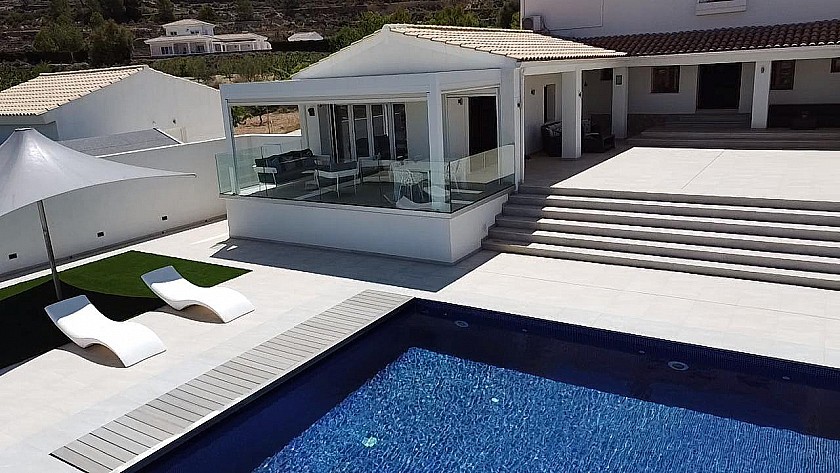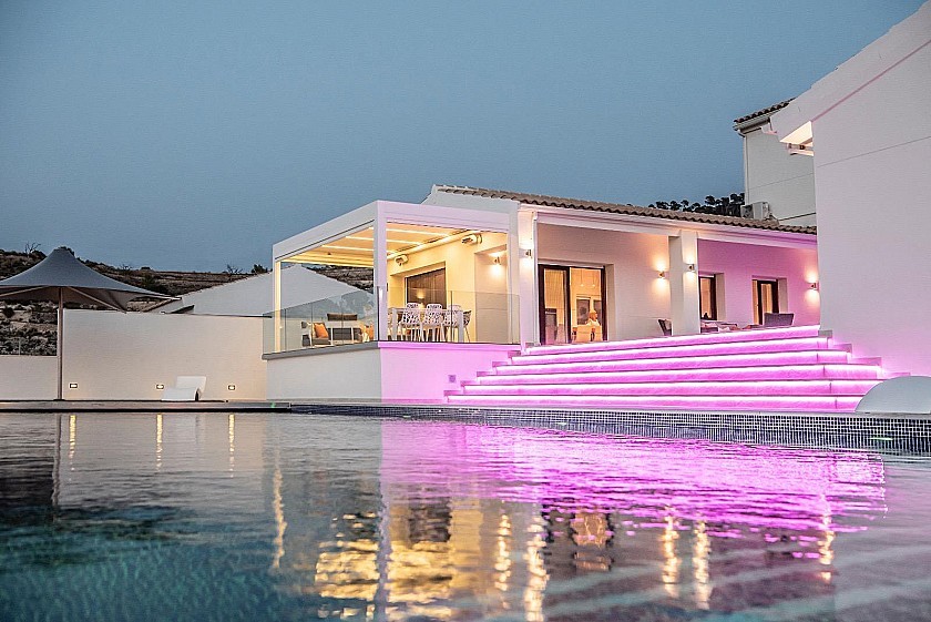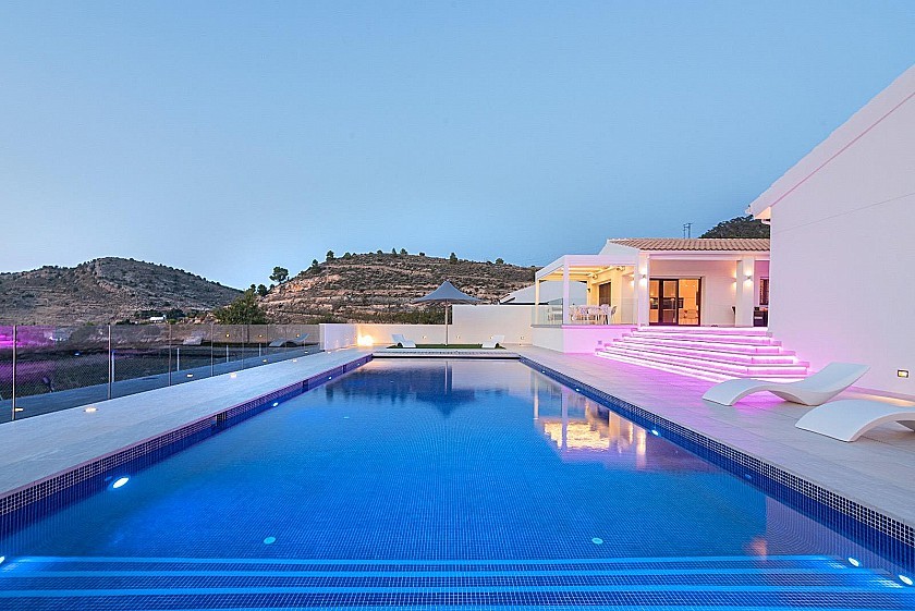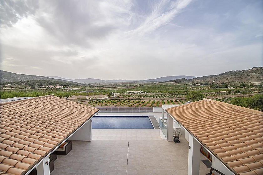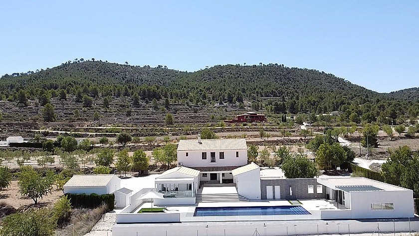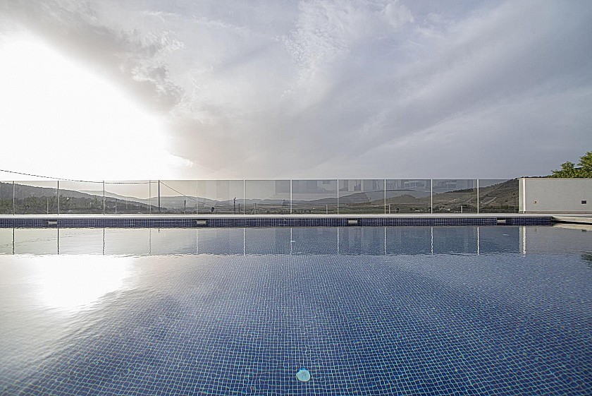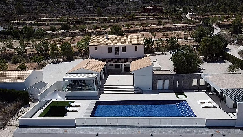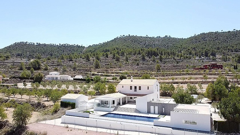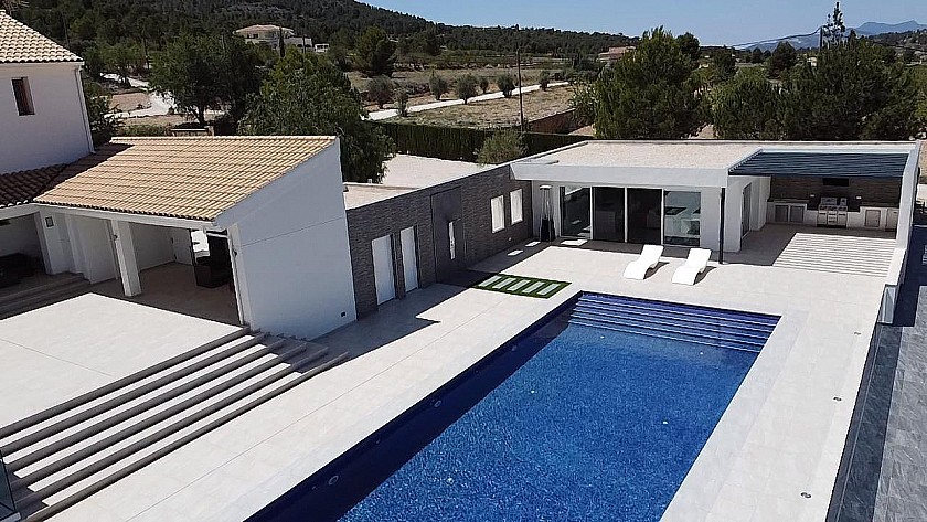 This magnificent villa is located in a beautiful area just outside the sought after town of Pinoso. It is situated in an elevated position, with incredible views of the Encebras valley. The property has been built and finished to a superior standard and offers luxury living. Electric entry gates open to the garden. The villa has a state of the art kitchen and dining room The high quality built in appliances include double Neff ovens and microwave The large island includes a top of the range induction hob complete with integral flush extractor fan that rises from the island at the touch of a button. An abundance of storage space with built in cupboards and drawers covers one side of the kitchen and includes a Miele dishwasher. Two full height integral Liebherr refrigerators complete the built in features of this beautiful kitchen. At one end of the kitchen there is large pantry and a smaller full height walk in cupboard . At the opposite end, Bi-fold glass doors open on to a purpose built covered terrace, perfect for al fresco dining. The terrace is covered with an electric metal roof that can be opened via the touch of a button. When additional shade is required, all four sides have electric blinds that can be controlled independently through a remote control that also controls light and heating on the terrace. The views from the kitchen are wonderful and the sunsets indescribable. All of the windows in the kitchen, including the two sets of Bi-Fold doors, have electric shutters. The main sitting room is large, light and airy, with double doors leading out to the central courtyard giving views over the Encebras valley. There is a warm and cozy second sitting room/snug, perfect for the winter evenings. Leading off the main sitting room there is the 5th double bedroom It benefits from a fitted wardrobe and lovely views to the east. Through a set of double doors at the other side of the sitting room is the 4th double bedroom again with fitted wardrobes and a large, en suite, beautifully fitted, shower room. A stunning wide tiled staircase, complete with chrome and glass banisters, leads up to the first floor where there is a magnificent master bedroom with walk in wardrobe and bathroom that includes, double sinks, bidet, toilet, bath and a large glass sided walk in shower. A total of 3 double bedrooms, all with Juliet balconies, walk in wardrobes and their own en suite facilities are located on this floor. All bedrooms have fantastic views over the surrounding countryside. A door off the glass panelled large landing leads out to a full width terrace with views to the natural park. Double electric awnings can be deployed whenever extra shade is required. On the same level as the kitchen, located across the Hacienda styled courtyard, the utility room includes cupboards and concealed laundry facilities including washing machine and a tumble dryer. The room has two sinks and a 5th toilet. The worktop and extensive storage allow for all your laundry needs. With multiple seating areas to suit all types of weather, this remarkable property just keeps on giving. Steps, complete with remote controlled integral lighting, take you down to pool area. This includes the large 16 metre x 6 metre swimming pool with fully integrated electric pool cover, and sunbathing terraces all around including one with high quality artificial grass and a fixed, specially commissioned, wind resistant parasol. From inside the pool you can still enjoy the magnificent views across the Encebras valley through the full pool width glass panels, all lit at night by uplights. At the opposite end of the pool is the all year round, pool room. This wonderfully contemporary room includes a fully fitted kitchen including an island and appliances to the same high spec as those in the main house. A full size living room and dining area gives plenty of space for those dinner parties whatever the time of year. As if that wasn’t enough, outside the pool room is a huge covered barbecue area with a top of the range fully fitted American gas barbecue. The work area includes a full sink, storage areas behind stainless steel doors and an outside refrigerator for those all important cold wines and beers. A large awning can be deployed to give extra protection from the sun at the height of summer. Views of the valley are maintained through the double windows and of course, down the length of the pool over the surrounding hills and mountains. The pool room benefits from the installation of the latest technology including Under Floor heating, full Wi-Fi, Satellite TV, Air Conditioning, full width flush wall mounted feature fire, remote controlled led lights, concealed ambient lighting etc. All lights are controllable by dimmer switches installed throughout the pool room and barbecue area. The pool, pool room and barbecue area all share the luxury of a stunning toilet and outside shower. Hot and cold water is derived from a designated boiler that is housed in the pool machine room next door to the toilet. All of these features make this room and this house a truly special place, at any time of the year. To the side of the house there is a 3 car garage with a remote control electric door and a side door for convenience. This amazing property just keeps giving, it truly does have it all. If you are looking for the perfect home this one is a must.