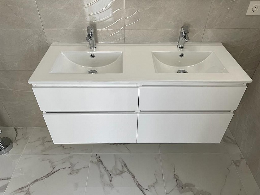 Bathrooms include a shower column, shower tray or bath, sink units (various colours to choose from) with sinks, taps and mirrors, plus a big selection of wall tiles., and a wide selection of ceramic floor tiles, with different colours, wood effect, etc.