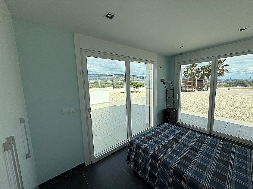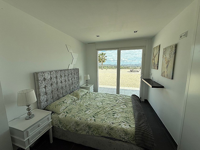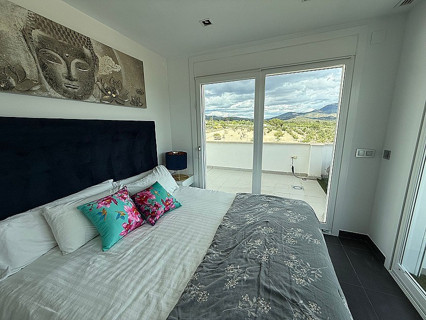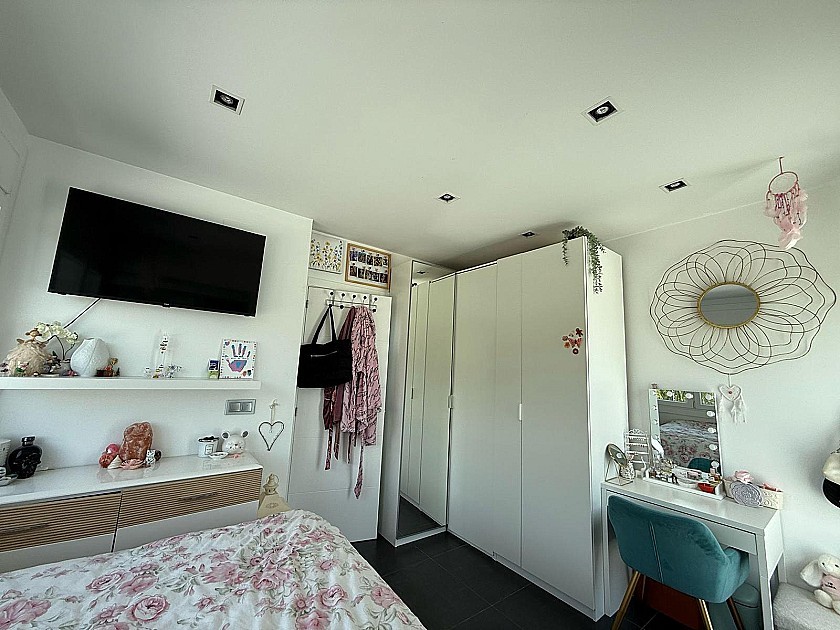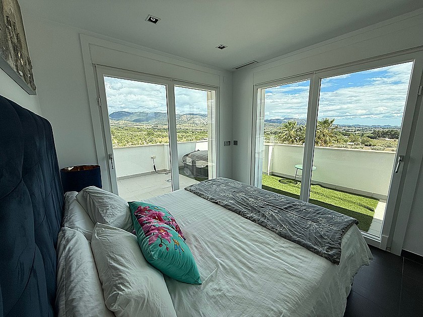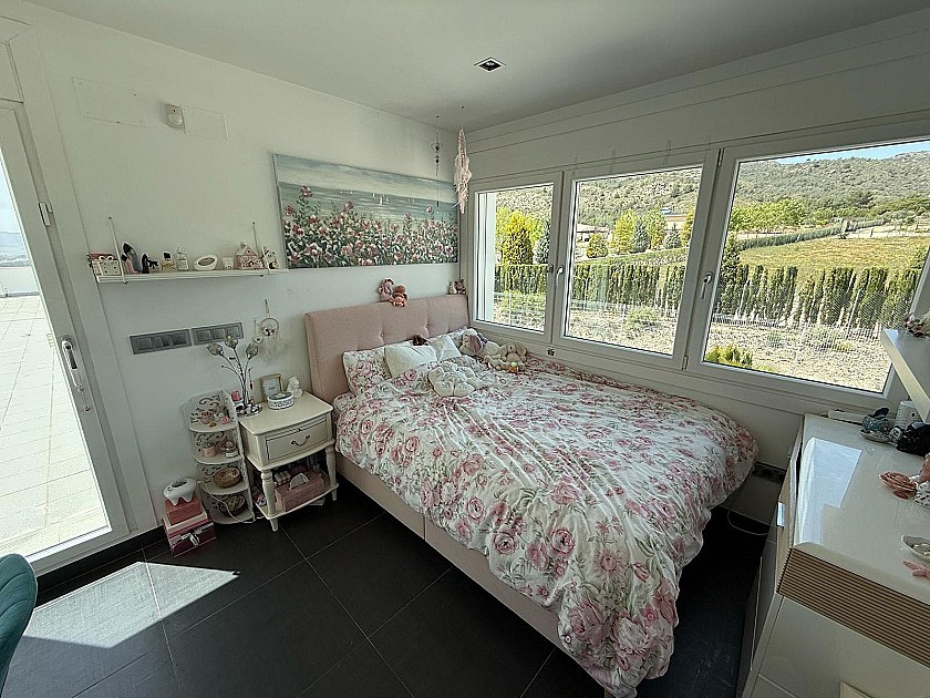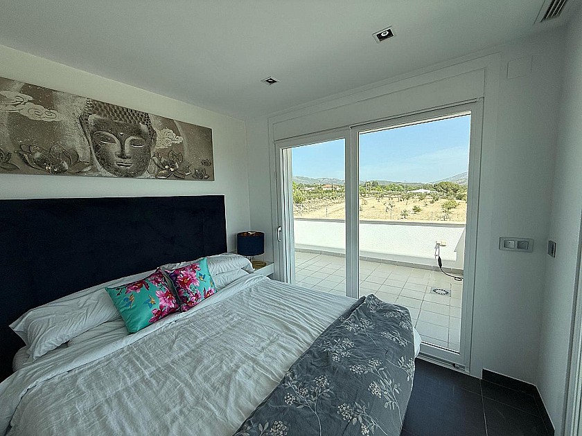 On the lower level, three generously sized double bedrooms share a full bathroom and all feature built-in wardrobes. Upstairs, the master suite boasts three large sliding doors opening onto a wraparound terrace, offering stunning views of Sax Castle—beautifully lit at night. The master suite also includes a walk-in dressing room and private ensuite.