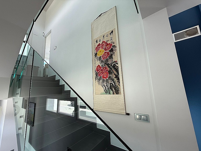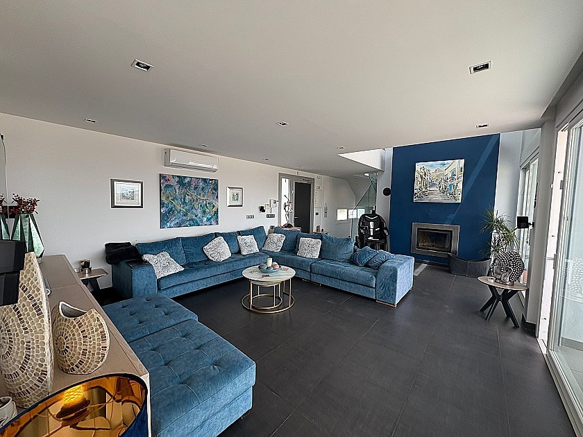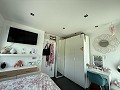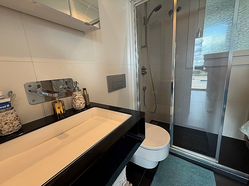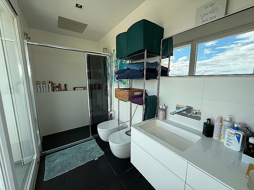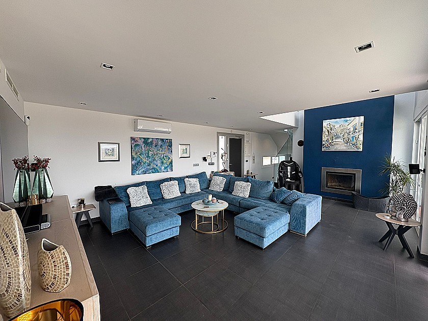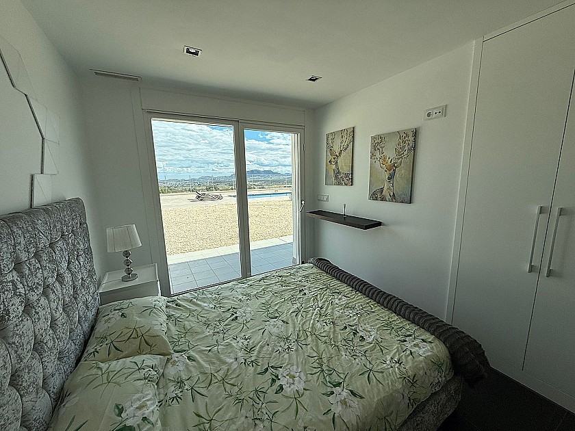 On the lower level, three generously sized double bedrooms share a full bathroom and all feature built-in wardrobes. Upstairs, the master suite boasts three large sliding doors opening onto a wraparound terrace, offering stunning views of Sax Castle—beautifully lit at night. The master suite also includes a walk-in dressing room and private ensuite.