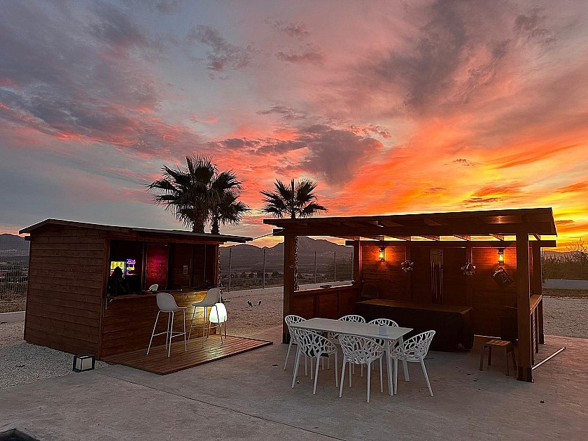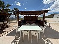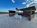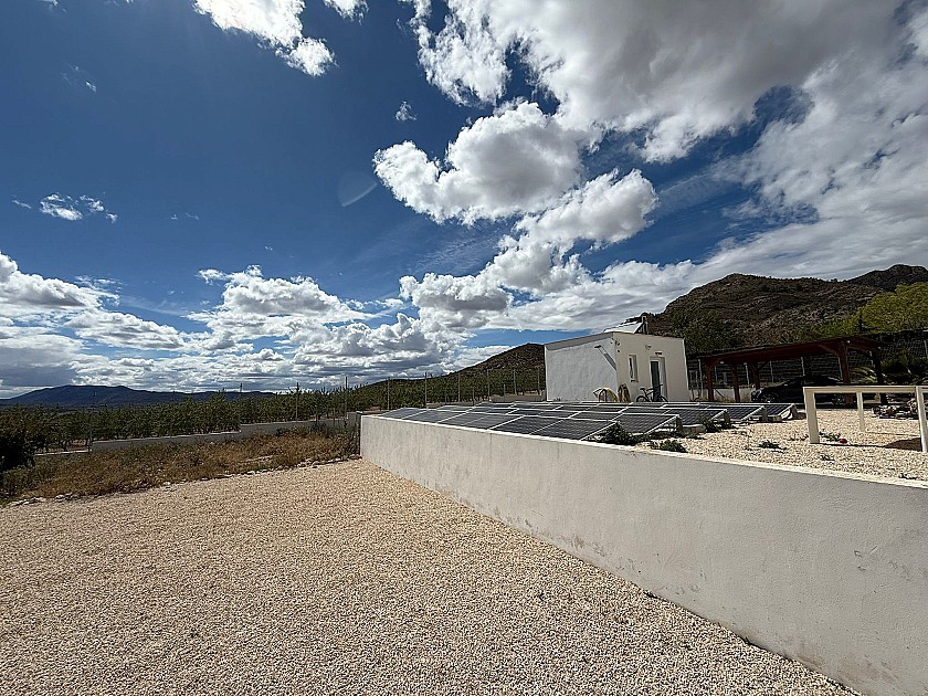 The landscaped, low-maintenance garden wraps around the home, featuring mature palm and olive trees. A high-quality fence and concrete wall enclose the immediate 2,000m² around the house, complete with an electric entrance gate. The remaining 8,700m² of flat land is planted with productive almond trees.
