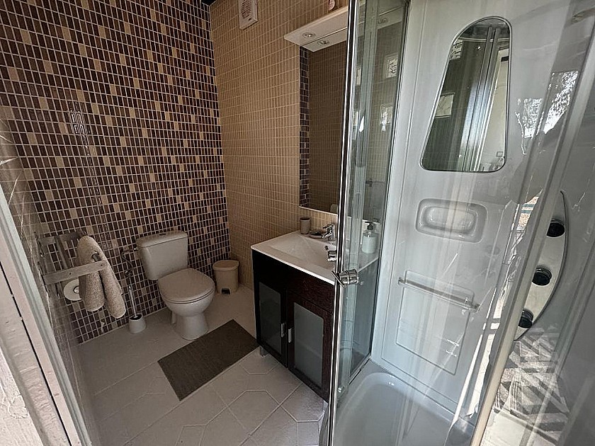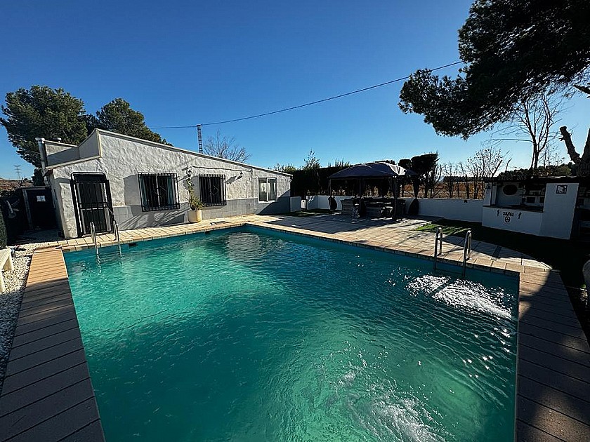 Fantastic Villa with a guest house and large swimming pool, nice bar and BBQ, the main villa has a large long glazed terrace perfect for various uses, then you enter the villa in to a living dining room with log burner and aircon, the hall way leads to a refurbished family bathroom, new kitchen and 3 double bedrooms one with ensuite which also has access to the pool area, outside you will find a well maintained garden with various storage sheds and the big guest house with its own kitchen and bathroom, the pool area is a perfect place to entertain with a new fully stocked bar and large patio area, the pool has a bubble cover. mains electric and water with good internet. the house has central heating but does require a new boiler
