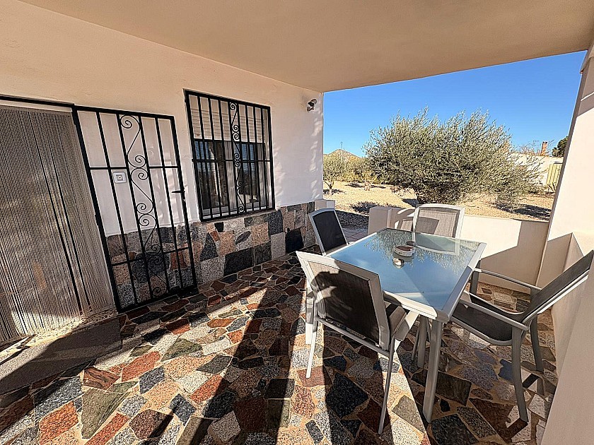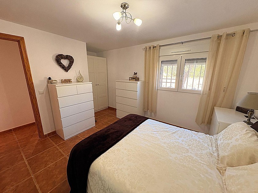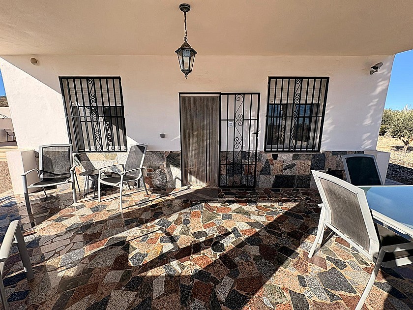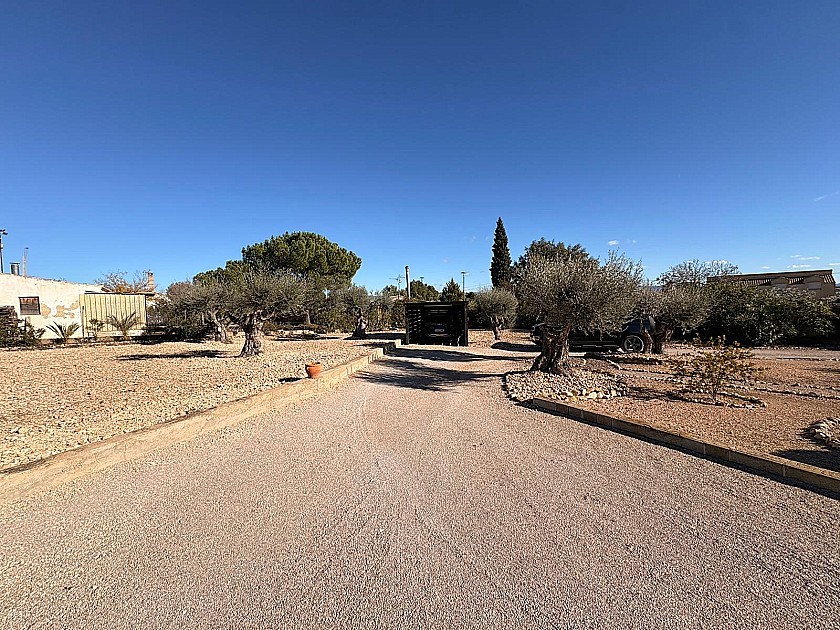 El terreno está totalmente vallado y muy bien mantenido, con olivos, almendros, granados y higueras en producción. Un porche techado sirve de aparcamiento cubierto, y una amplia pérgola permite disfrutar del exterior con sombra en las horas más cálidas del día.