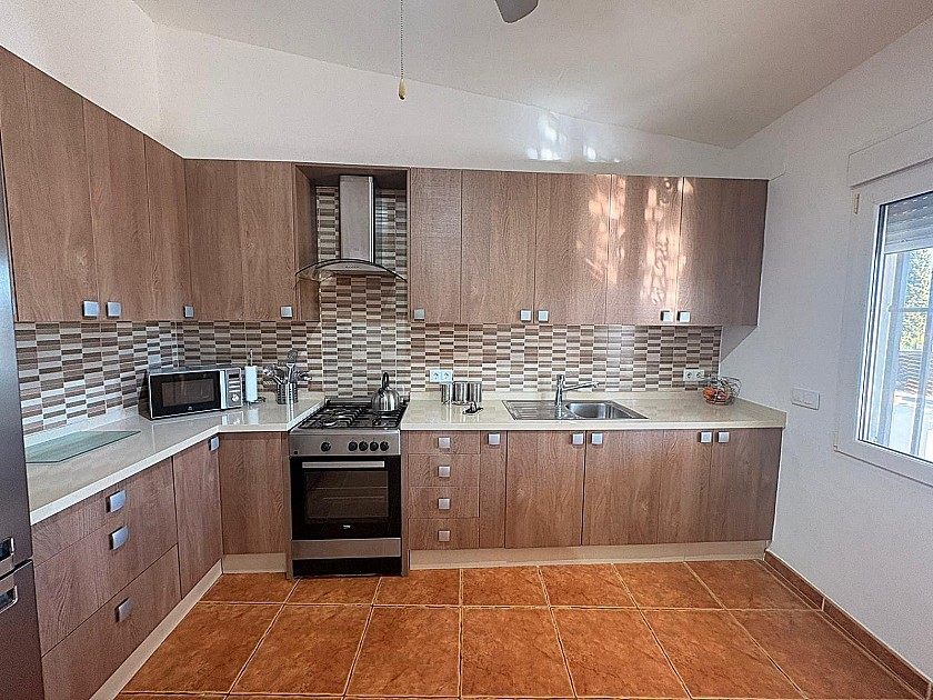 La villa cuenta con una terraza cubierta con zonas de descanso en ambos lados. Al acceder a la vivienda, se encuentra una cocina-comedor amplia y luminosa con elegantes encimeras de granito, estufa de leña, cocina a gas y un cuarto de lavandería independiente equipado con armarios, lavadora y frigorífico-congelador.