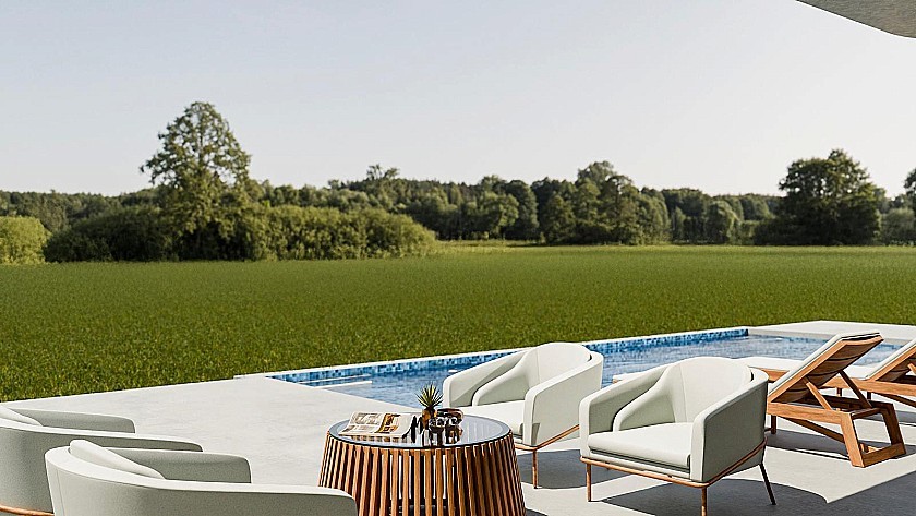 En el modelo mostrado, la casa de invitados, cocina de verano y terraza adicional de hormigón no están incluidas (opcionales).
