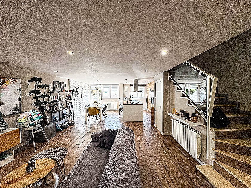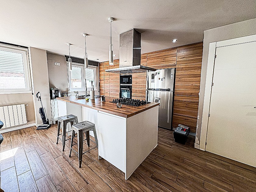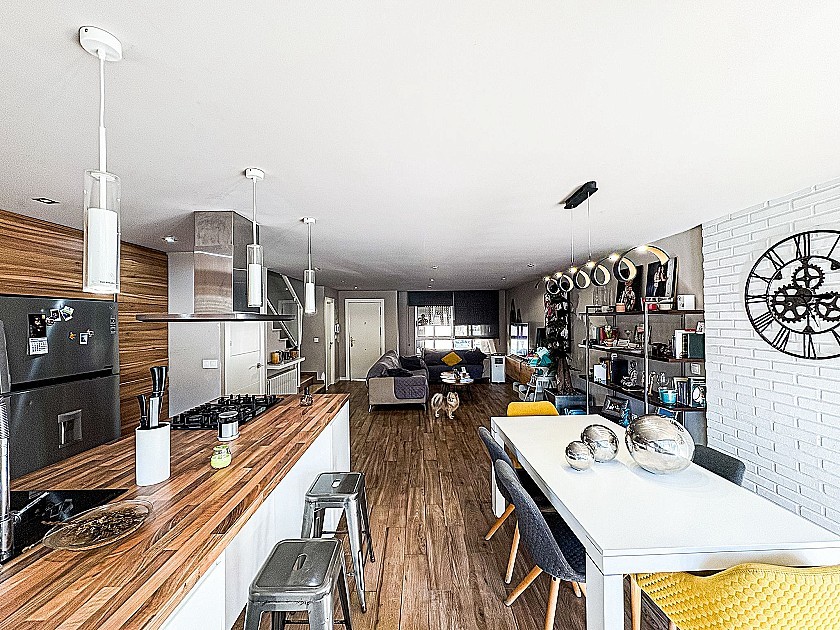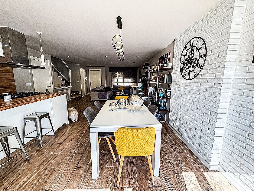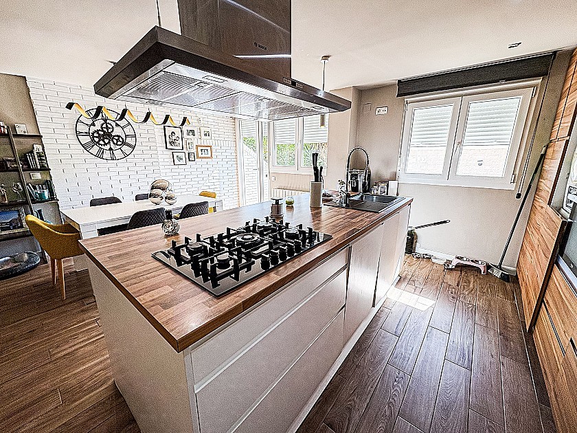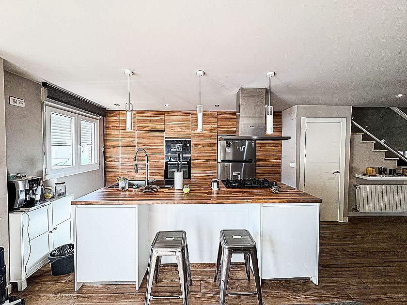 La casa dispone de un salón-comedor con cocina abierta, perfecto tanto para la vida familiar como para recibir invitados. La cocina está completamente equipada con acabados de alta calidad y un diseño funcional y moderno.