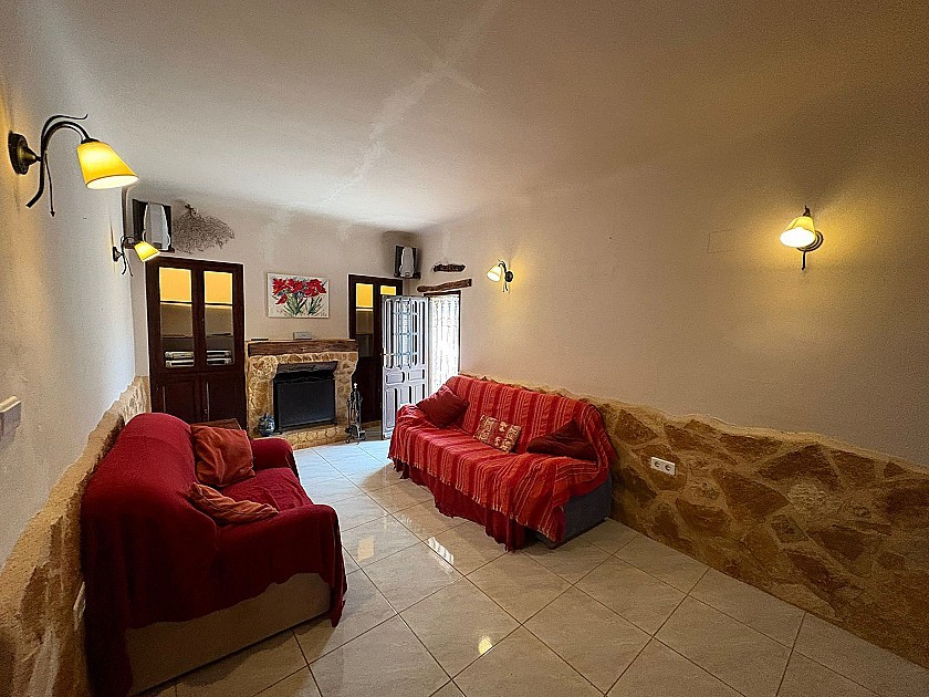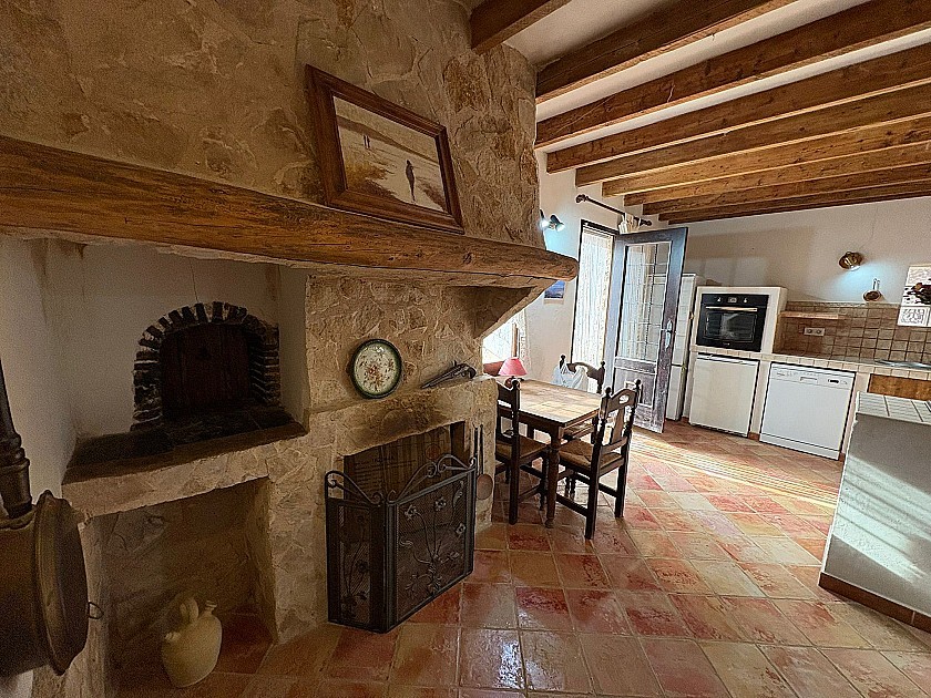 Un espacio cálido y acogedor con una chimenea de piedra tradicional, perfecto para las noches de invierno. Gracias a los gruesos muros de piedra, la casa se mantiene fresca en verano. Un rincón adyacente se utiliza actualmente como despacho.