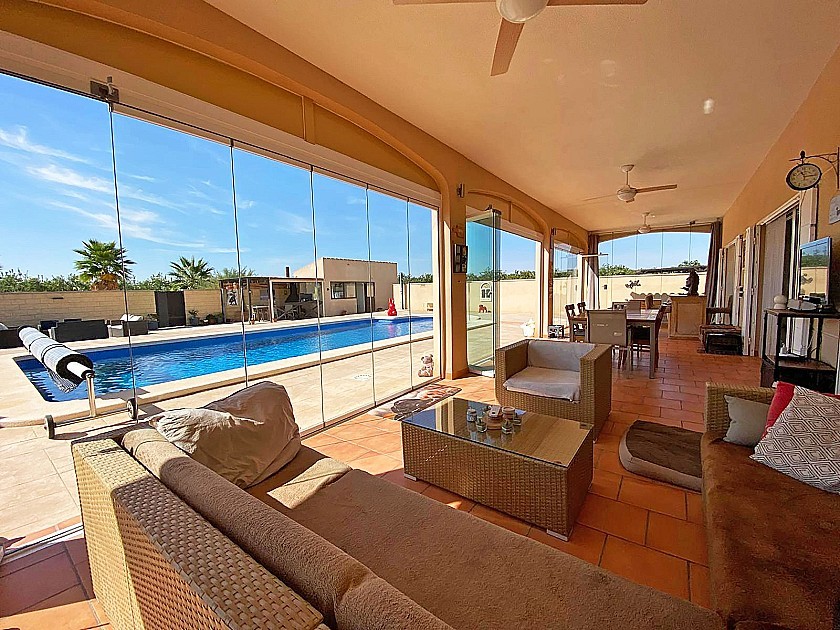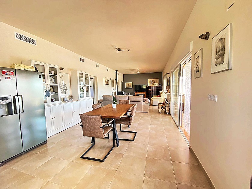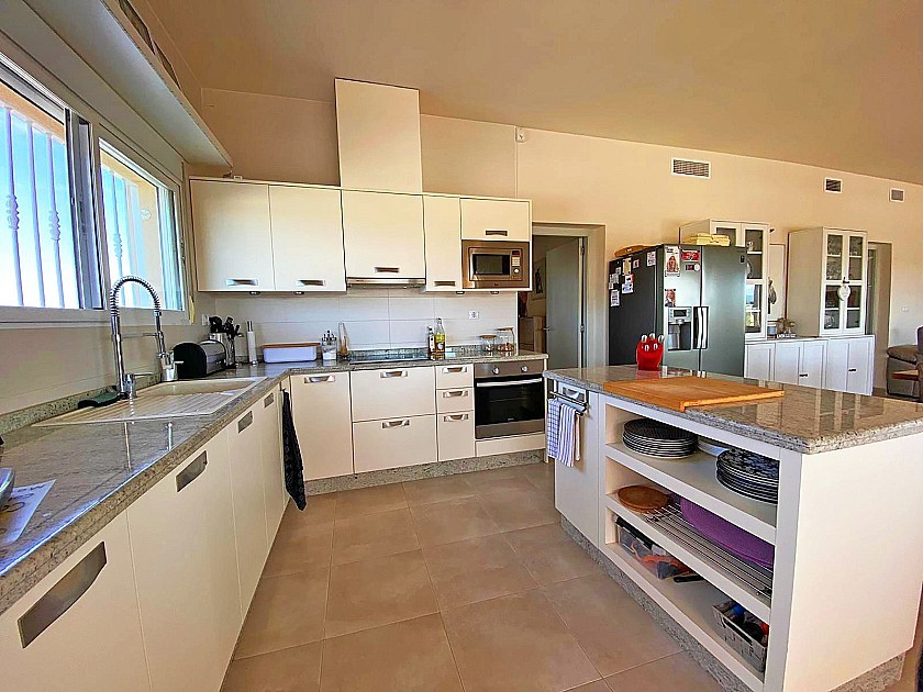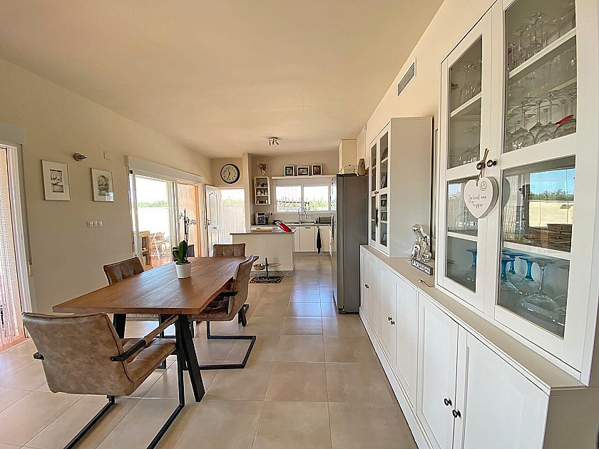 Al entrar en la villa, verá su hermosa terraza grande, la mayor parte acristalada, perfecta para usar durante todo el año. El salón, el comedor y la cocina están distribuidos en un diseño de planta abierta, lo que hace de esta villa una zona muy sociable. El salón tiene una estufa de pellets perfecta para eliminar el frío en los meses más fríos del invierno. La cocina tiene elegantes unidades de color crema e incorpora una isla central, los utensilios de cocina son de granito. La villa tiene instalación de aire acondicionado que ahora necesita las unidades.