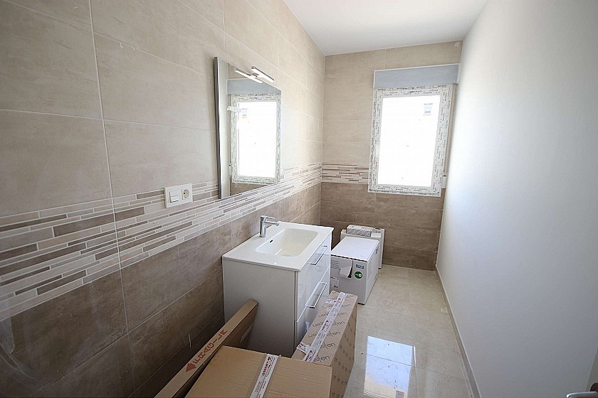 Los baños incluyen columna de ducha, plato de ducha o bañera, lavabos (en varios colores a elegir) con lavabos, grifería y espejos, además de una amplia selección de azulejos de pared y suelos cerámicos de diferentes colores, efecto madera, etc.