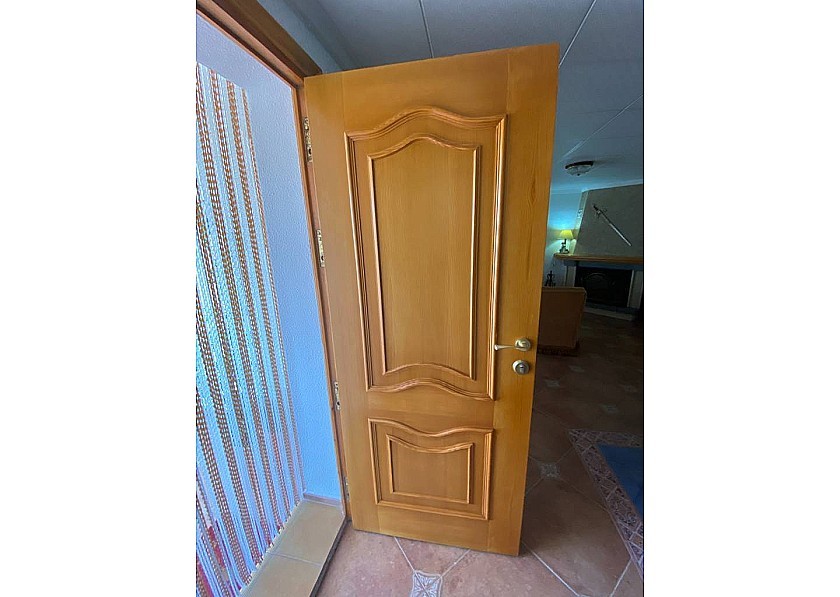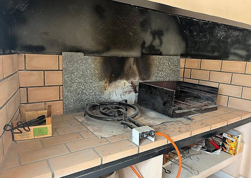 2. La casa de invitados: En las fotos y el vídeo se puede ver que hay dos puertas: una da al baño independiente con espacio para la lavadora, etc., y la otra da a un espacioso salón-comedor-dormitorio. Actualmente hay dos sofás cama, pero hay espacio suficiente para una cama doble. Hay una impresionante chimenea de leña y un horno de hierro fundido, ideal para preparar pan o pizza recién hechos, y un arco que da acceso a una cocina americana y una despensa amplia.
