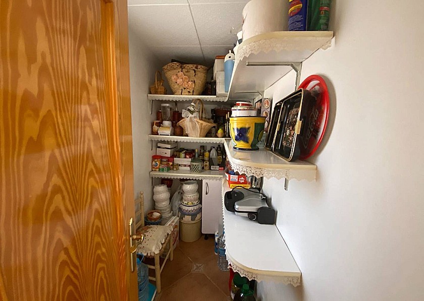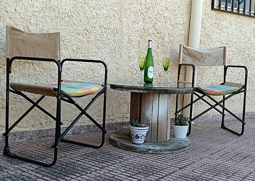 Frente a la entrada hay otra puerta metálica más pequeña que, al abrirse, permite ver el espacio de almacenamiento para la bomba y el filtro de la piscina, además de más espacio para aparatos eléctricos. Un pequeño patio con mesa y sillas ofrece la posibilidad de comer al aire libre.