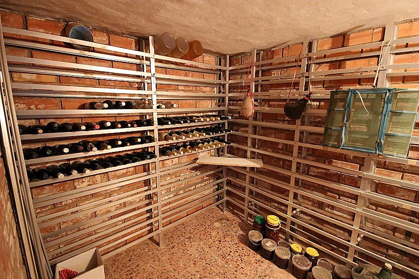Au rez-de-chaussée, nous entrons dans la maison par la belle terrasse couverte, dans une grande salle à manger et un salon. Il y a un escalier dans le coin du salon qui mène à la cave à vin privée. À travers l'arc caractéristique dans le couloir, cela mène à la cuisine équipée, au garde-manger, à trois chambres doubles et à la salle de bains familiale. Dans le couloir se trouve également l'entrée de l'atelier, avec un évier intégré dans le coin et une autre porte qui mène aux escaliers du premier étage.