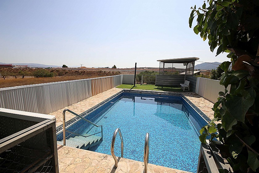 La piscine est hors sol. Entièrement équipé avec pompe et système de filtration, le tout logé dans la partie inférieure de la piscine. Ici, vous avez également les commandes d'eau d'irrigation pour maintenir le jardin en parfait état. La piscine a une échelle au niveau du jardin d'un côté, et de l'autre côté une belle passerelle voûtée qui mène au porche, avec un toboggan pour enfants d'un côté et des balançoires sous les arches.