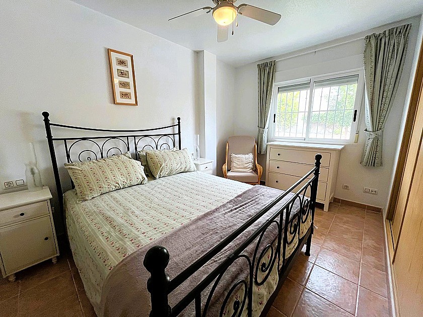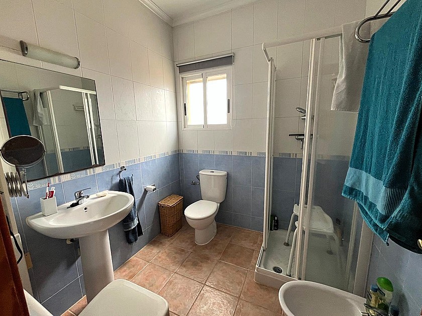 La propriété offre quatre chambres doubles spacieuses, dont deux avec salle de bains privative, toutes équipées de placards, de ventilateurs de plafond et de vues panoramiques. La suite parentale, située au dernier étage, dispose de sa propre salle de bains et d'une terrasse privée. Au rez-de-chaussée, une autre chambre s'ouvre directement sur le jardin paysager.