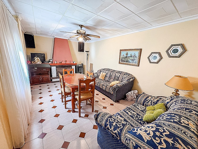 - Grand salon-salle à manger, équipé d’une cheminée et d’un ventilateur de plafond, créant une atmosphère chaleureuse et accueillante.