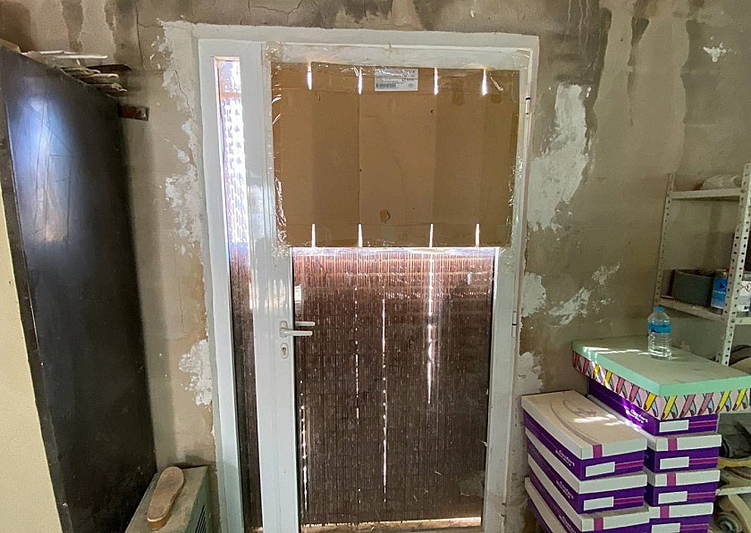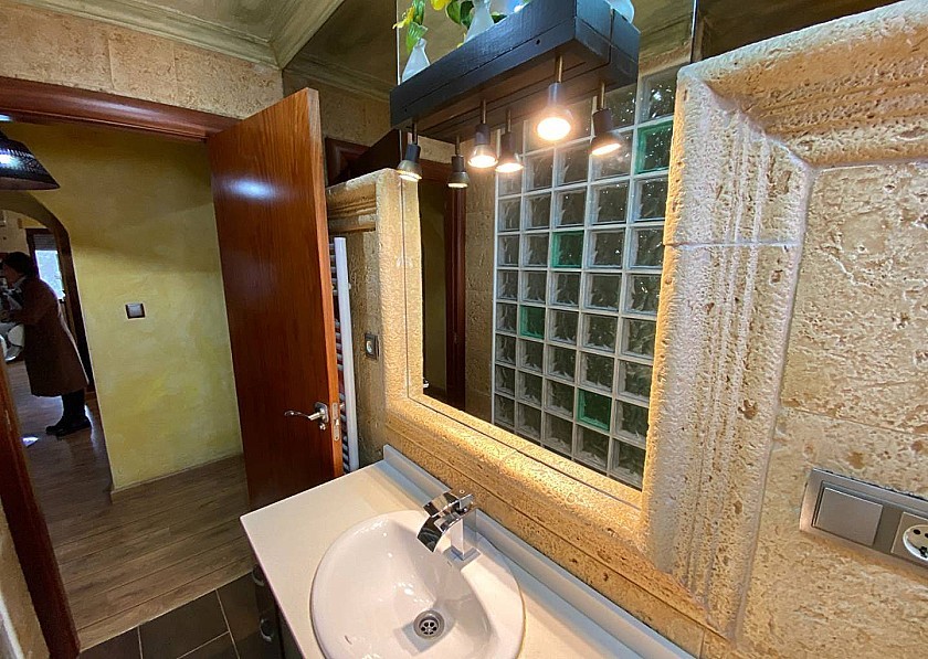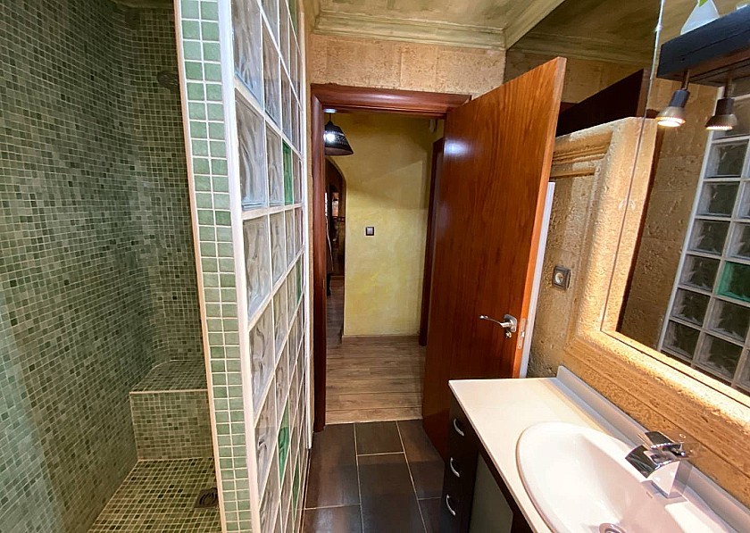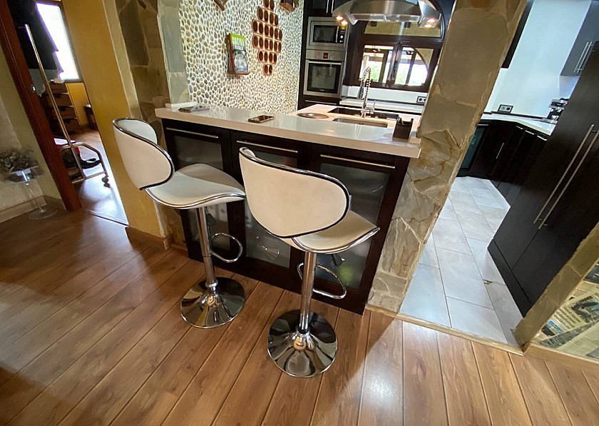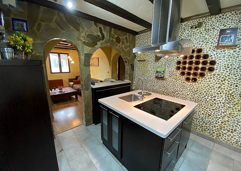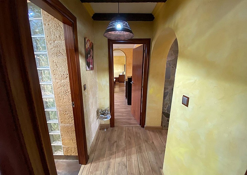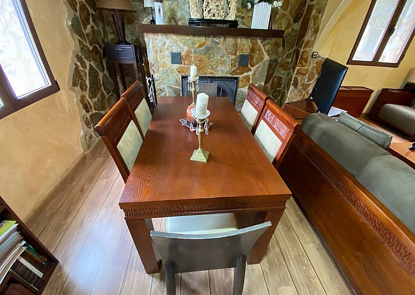 Une porte traditionnelle en bois massif de haute qualité s'ouvre sur un petit mais charmant couloir d'où vous pouvez accéder à gauche ou à droite à deux pièces à vivre. À droite se trouve la salle à manger avec accès par des portes-fenêtres au salon extérieur et à l'espace barbecue.