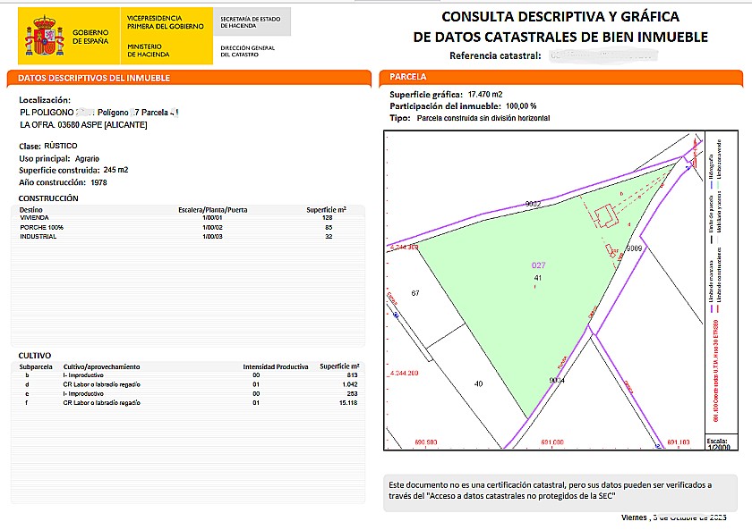 Het overige deel is gescheiden door een hek en is ongeveer 2.500 m² groot. Hier vindt u de toegangspoort, de oprit en het perceel zelf.