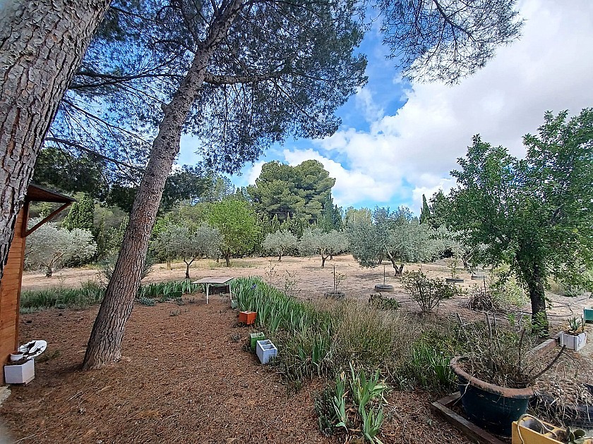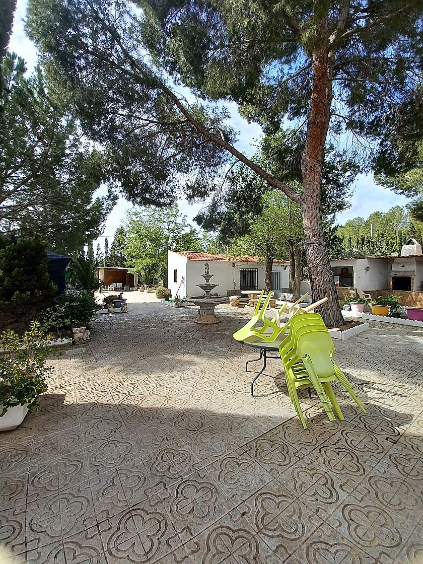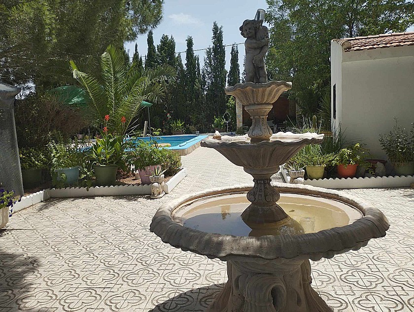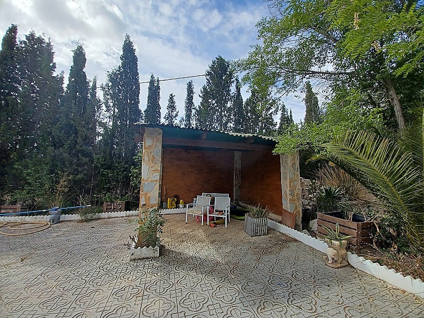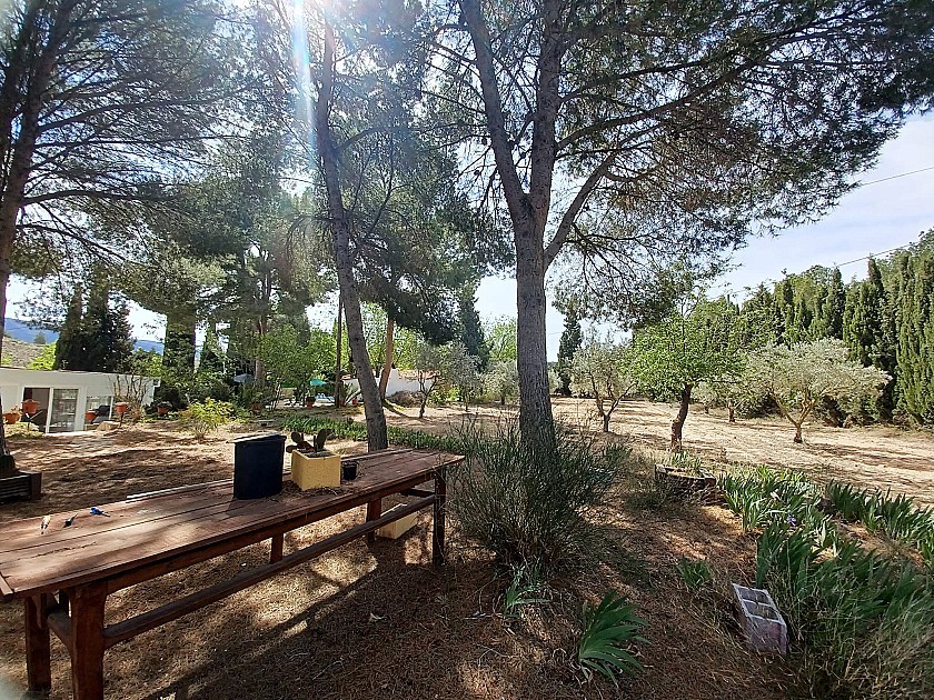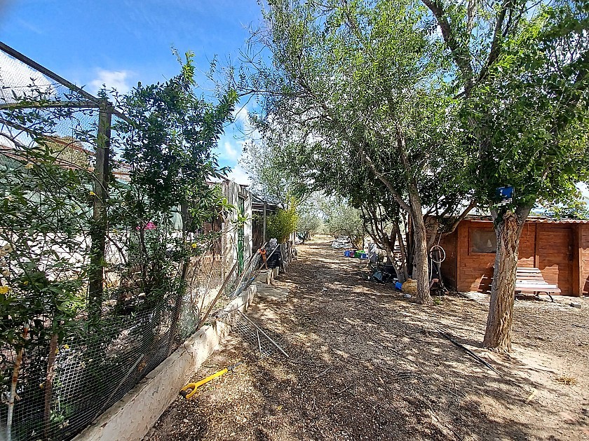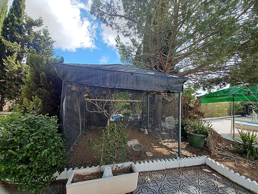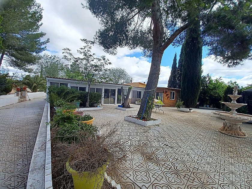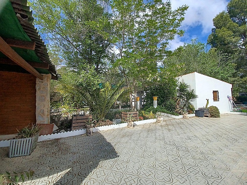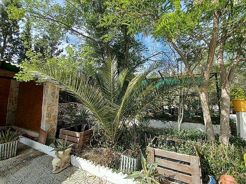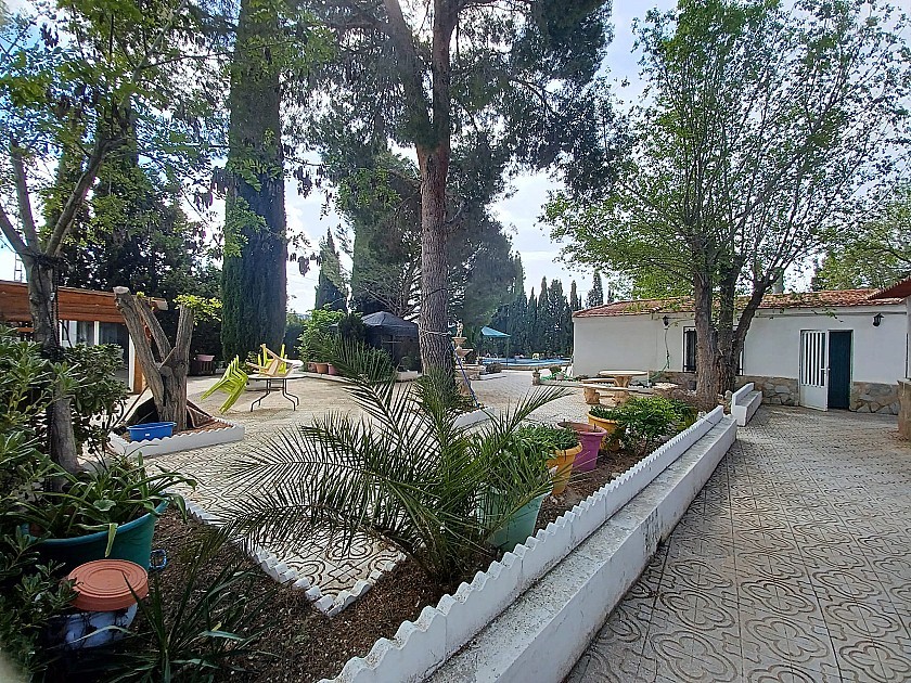 U komt binnen via een met bomen omzoomde oprit en vindt het huis omringd door tuinen. Een groot terras en een zwembad van 8 x 4 m bevinden zich voor het huis, met een buitenkeuken, barbecue, kleine vijver, volière en casita. Er zijn twee houten hutten in de tuin en een derde aan het huis vast voor opslag.