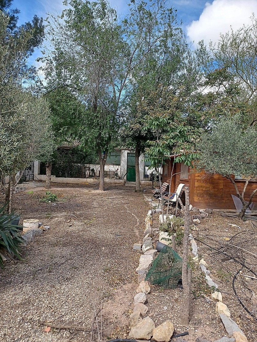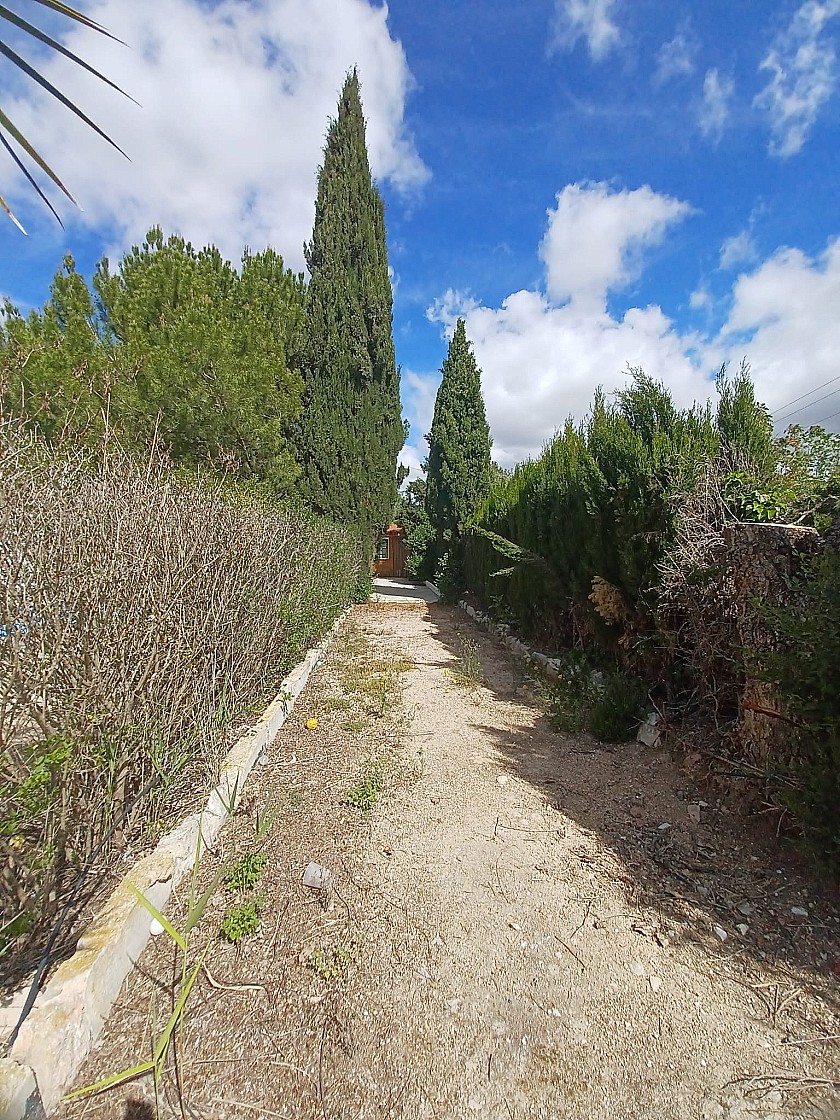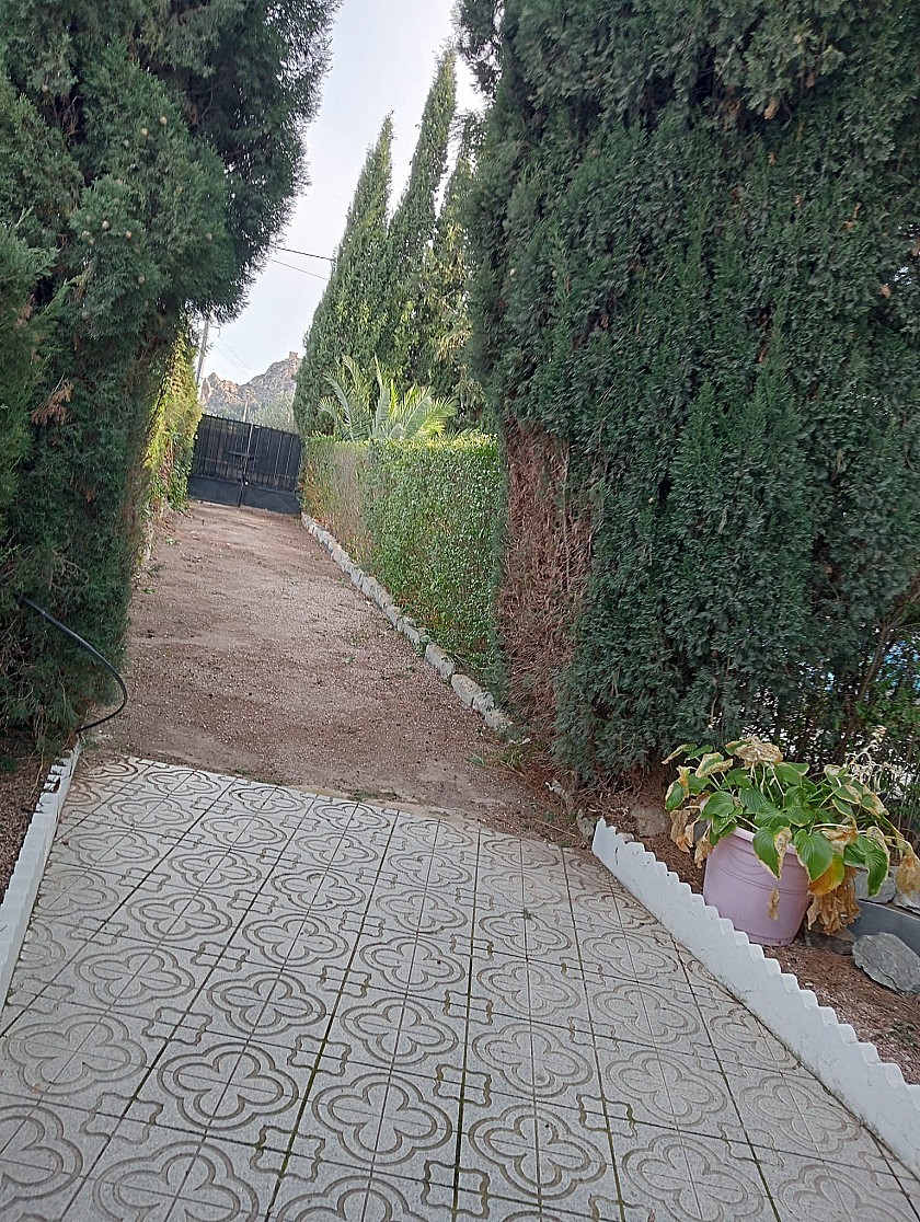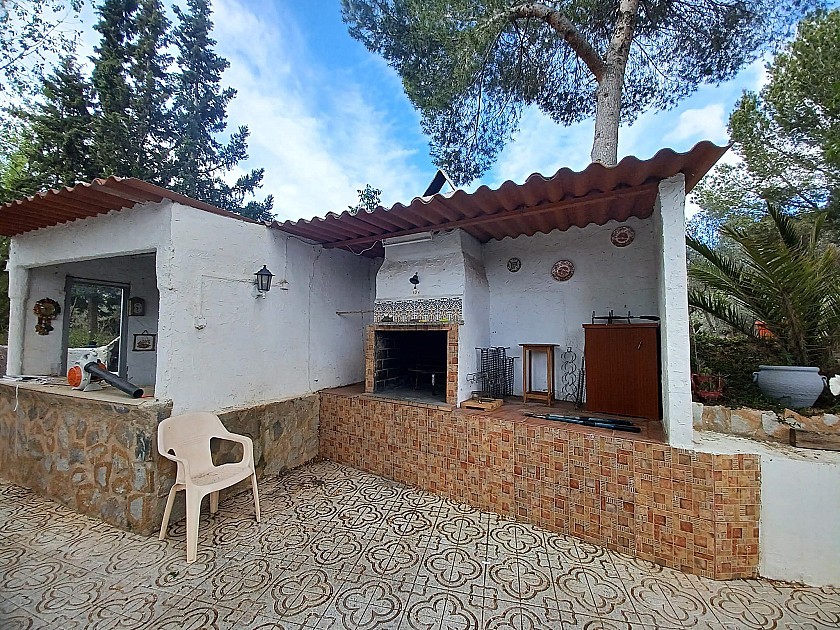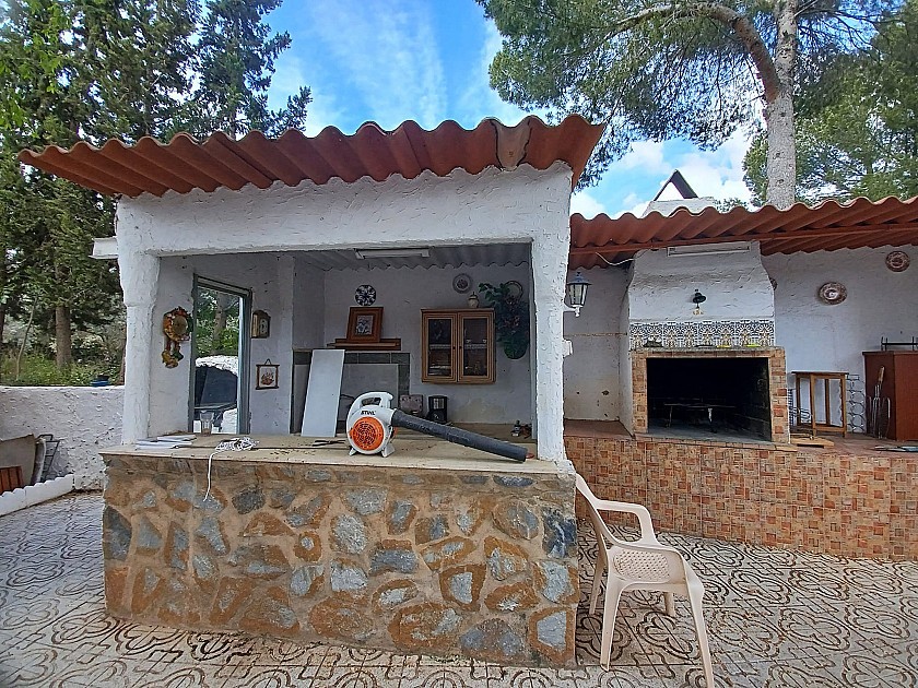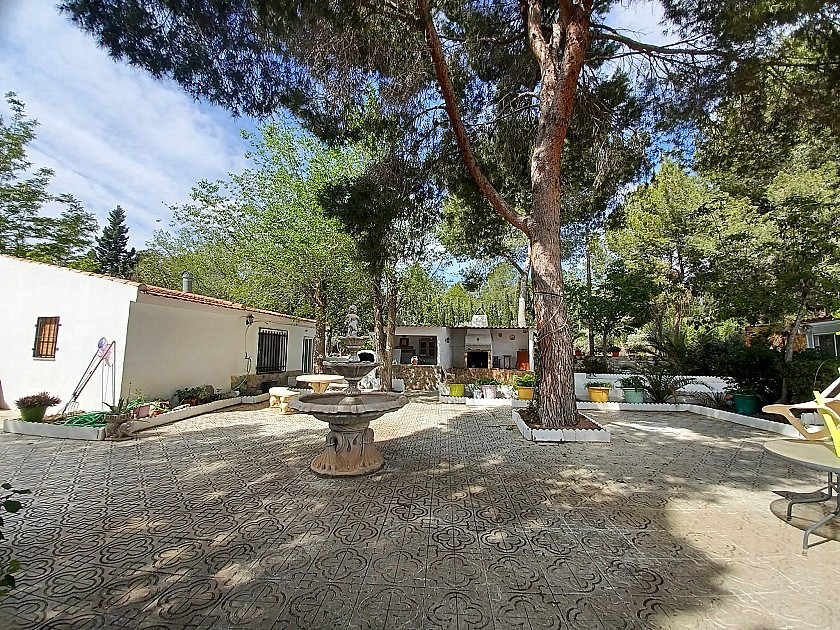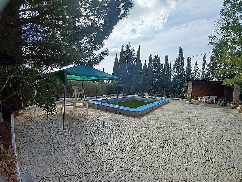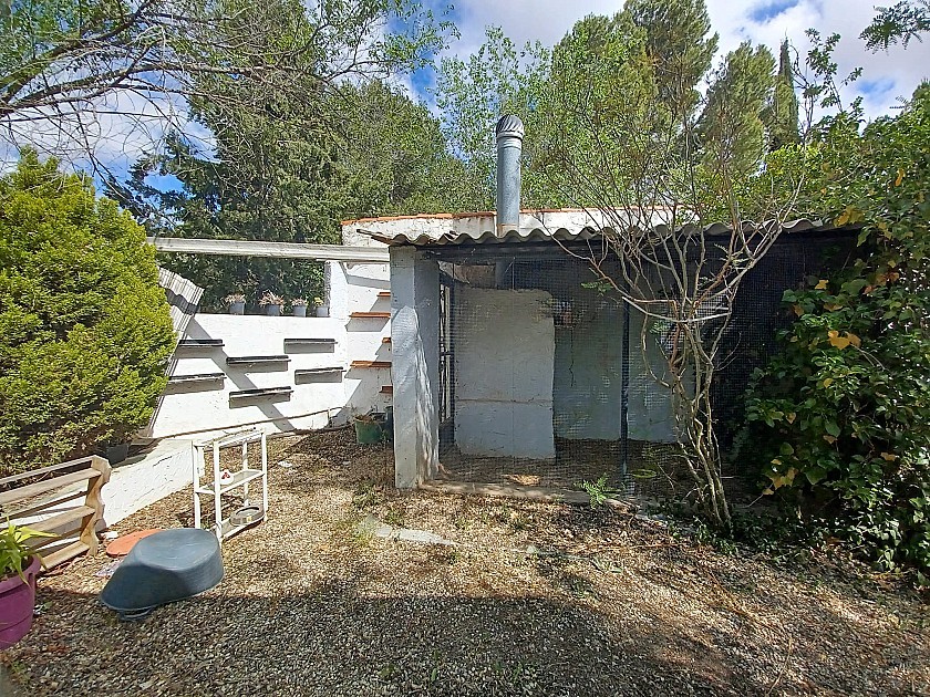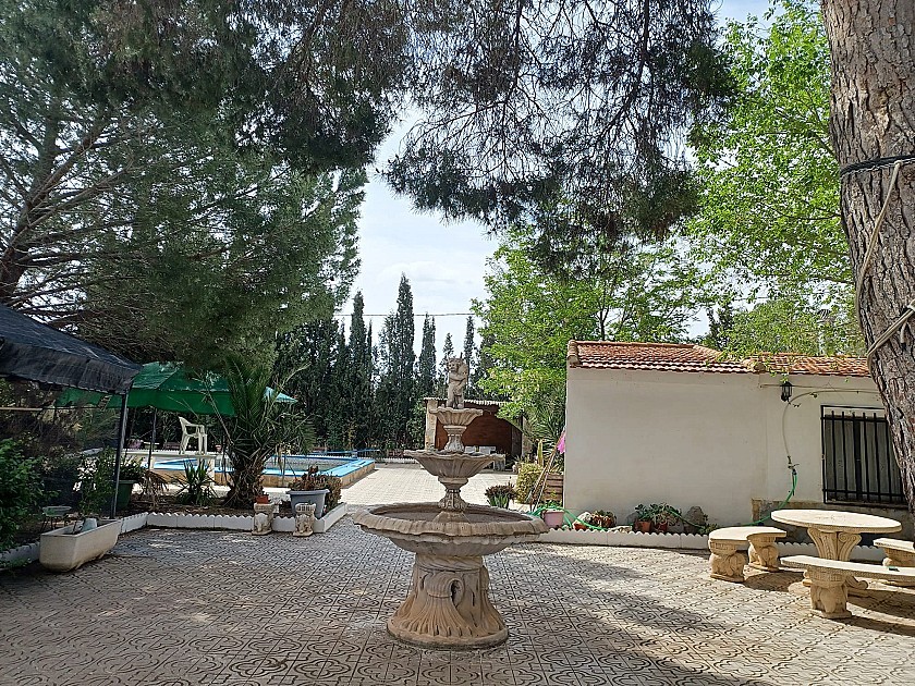 U komt binnen via een met bomen omzoomde oprit en vindt het huis omringd door tuinen. Een groot terras en een zwembad van 8 x 4 m bevinden zich voor het huis, met een buitenkeuken, barbecue, kleine vijver, volière en casita. Er zijn twee houten hutten in de tuin en een derde aan het huis vast voor opslag.