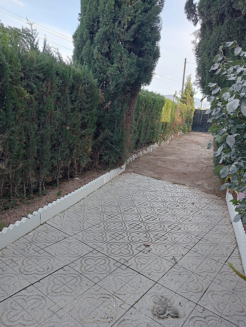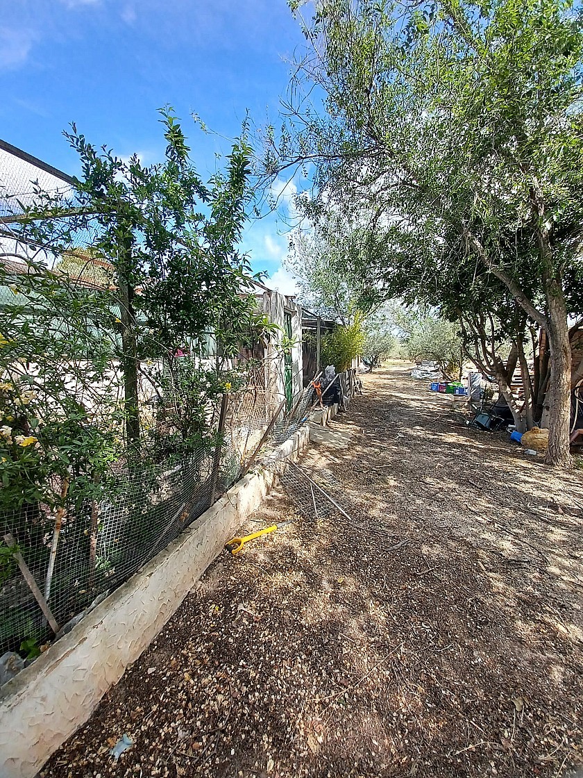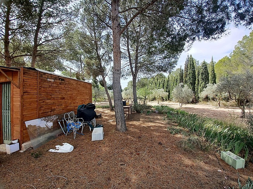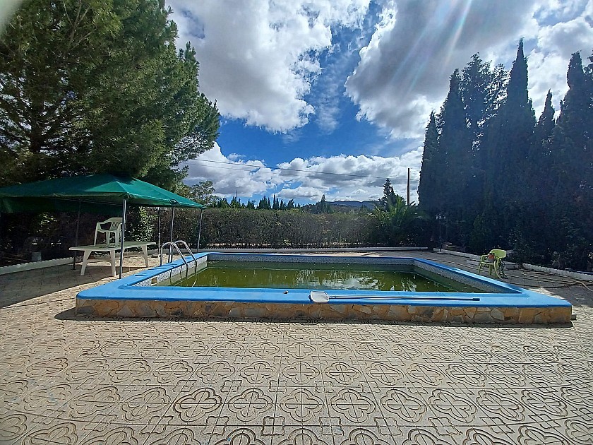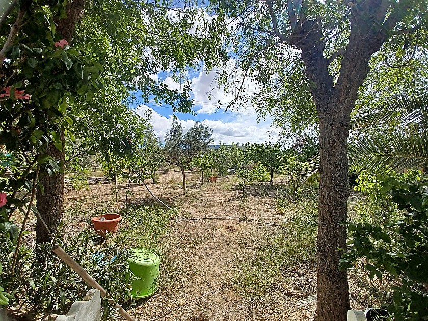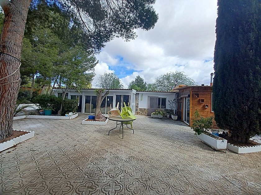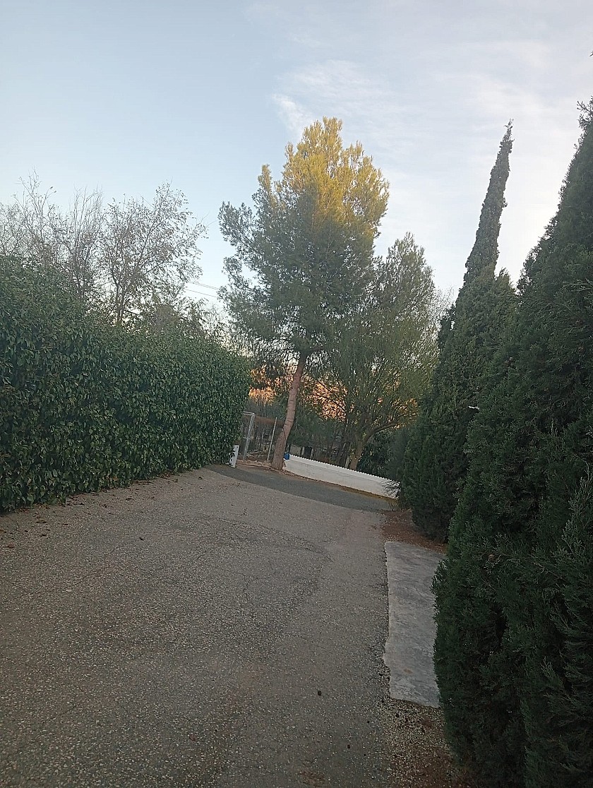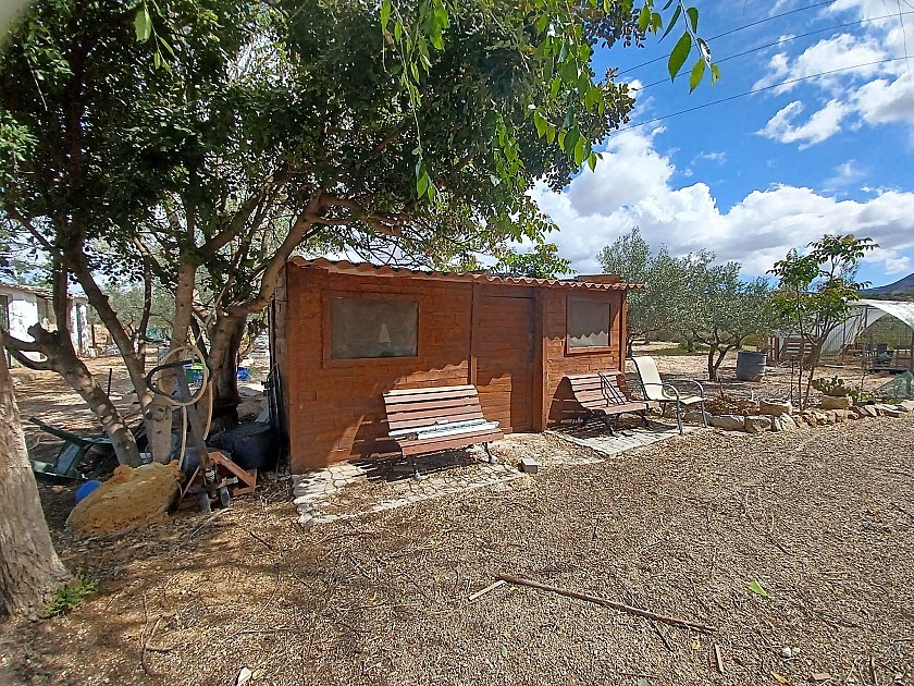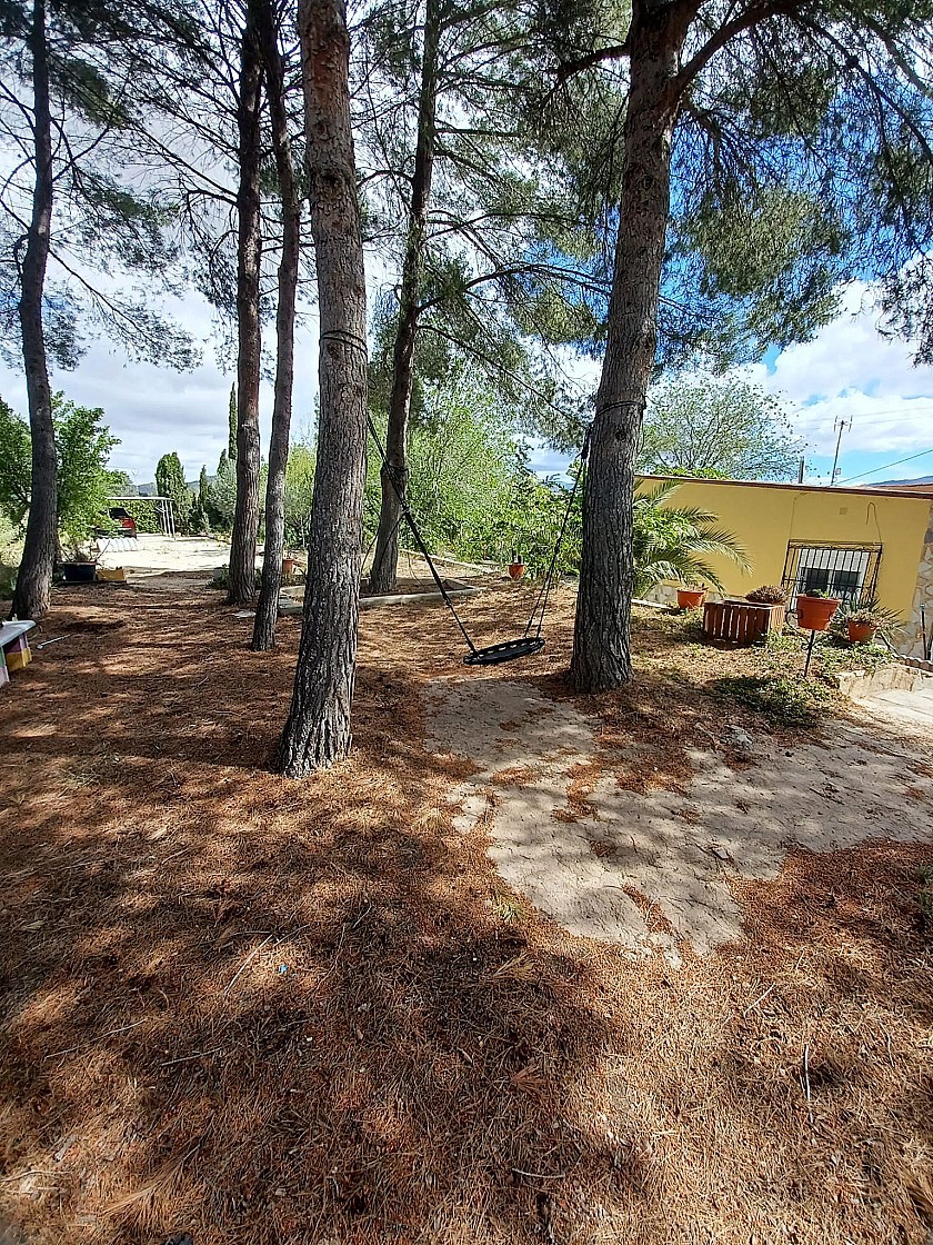 U komt binnen via een met bomen omzoomde oprit en vindt het huis omringd door tuinen. Een groot terras en een zwembad van 8 x 4 m bevinden zich voor het huis, met een buitenkeuken, barbecue, kleine vijver, volière en casita. Er zijn twee houten hutten in de tuin en een derde aan het huis vast voor opslag.