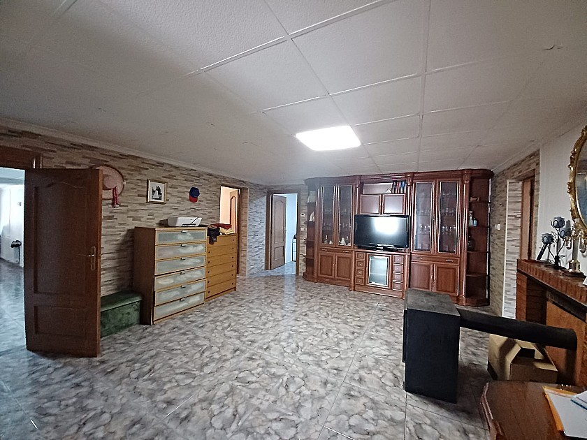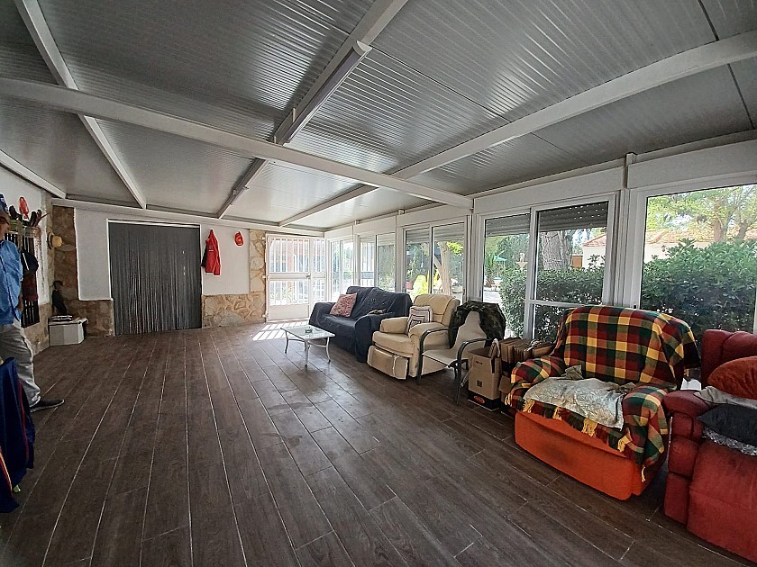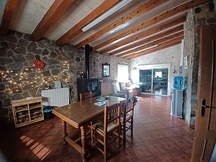 U komt binnen via een groot, afgesloten terras/zomerkamer met grote ramen die uitkijken op het terras en het zwembad, waar u het hele jaar door zon en schaduw heeft. Via een deur komt u in de ruime hal en een andere deur naar de woonkamer met een houtkachel.