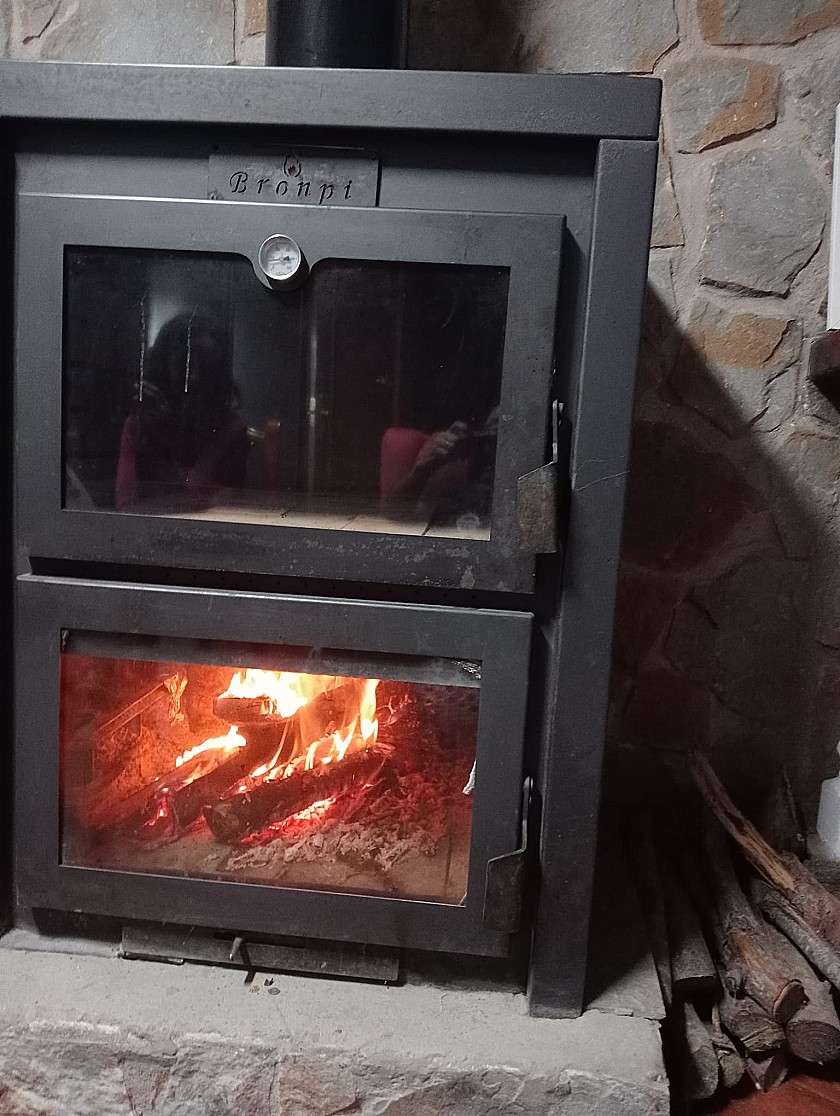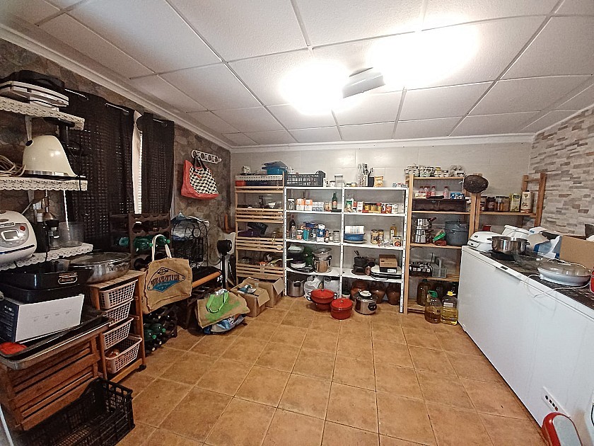 Vanuit de woonkamer leidt een deur naar de zeer grote woonkeuken met een volledig ingebouwde rustieke keuken, airconditioning, een enorme houtkachel met oven en een grote glazen deur naar een extra vierde slaapkamer of berging (momenteel in gebruik als grote pantry).