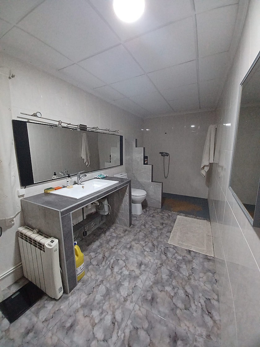 Buiten de woonkamer bevindt zich ook een grote badkamer met toilet, grote wastafel en inloopdouche.