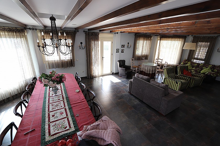 Door de openslaande deuren naar de woon/eetkamer met een balkenplafond en een trap van de allerhoogste kwaliteit die net zo groot is als de prachtige open haard. Er staat momenteel een eettafel en stoelen voor 12 personen waardoor u een idee krijgt van de grootte van de ruimte.